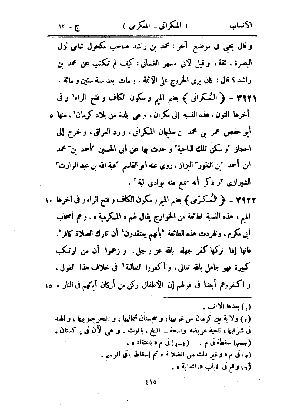 بضم الميم وسكون الكاف وفتح الراء وفي آخرها الميم، هذه النسبة لطائفة من الخوارج يقال لهم «المكرمية» ، وهم أصحاب أبى مكرم، وتفردت هذه الطائفة [4] بأنهم يعتقدون [4] أن تارك الصلاة كافر [5] ، فإنها إذا تركها كفر لجهله باللَّه عز وجل، وزعموا أن من ارتكب كبيرة فهو جاهل باللَّه تعالى، وأكفروا النعالية [6] في خلاف هذا القول، واكفروهم أيضا في قولهم إن الأطفال ركن من أركان آبائهم في النار.