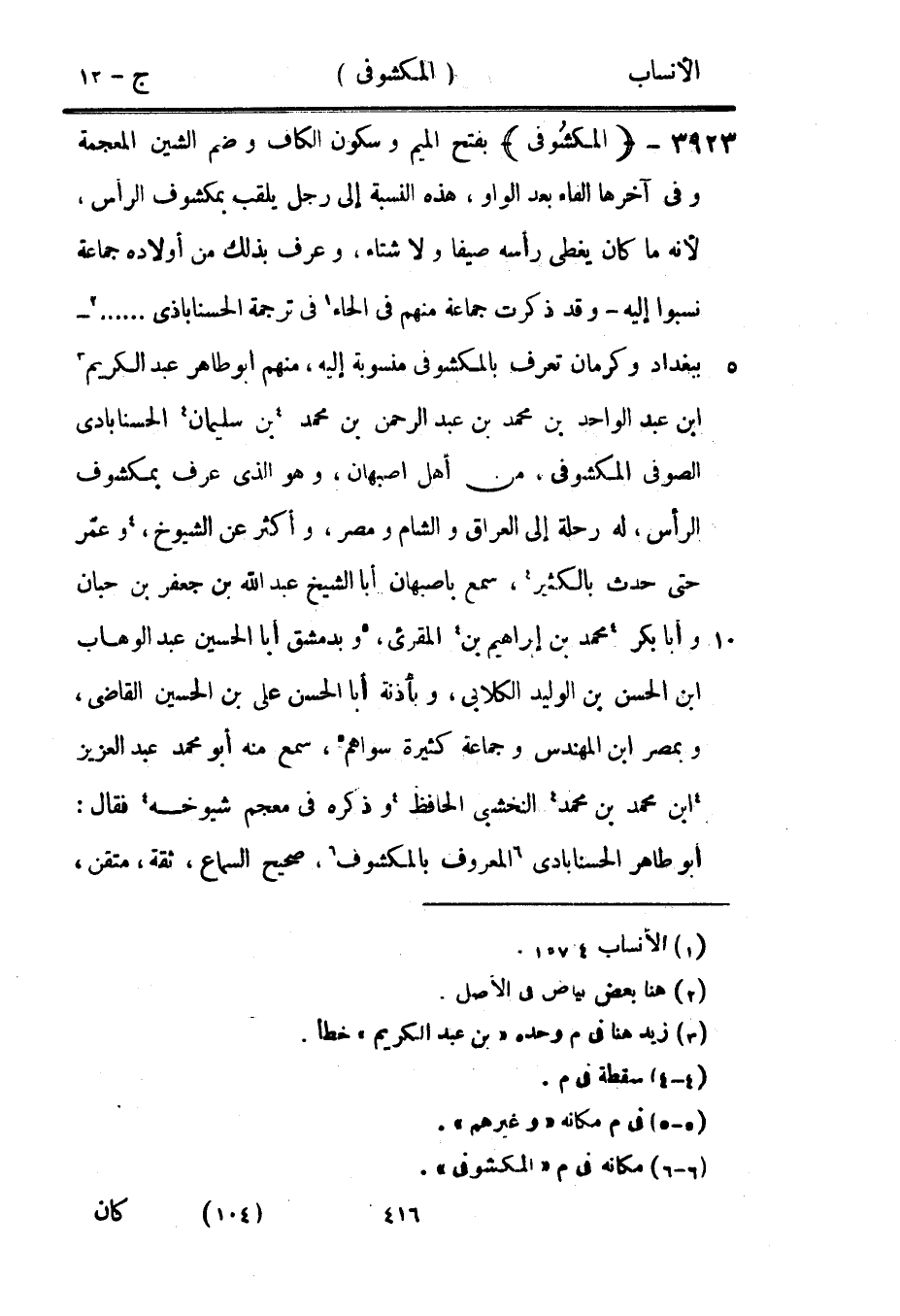 بفتح الميم وسكون الكاف وضم الشين المعجمة وفي آخرها الفاء بعد الواو، هذه النسبة إلى رجل يلقب بمكشوف الرأس، لأنه ما كان يغطى رأسه صيفا ولا شتاء، وعرف بذلك من أولاده جماعة نسبوا إليه- وقد ذكرت جماعة منهم في الحاء [1] في ترجمة الحسناباذى ... [2]- ببغداد وكرمان تعرف بالمكشوفى منسوبة إليه، منهم ابو طاهر عبد الكريم [3] ابن عبد الواحد بن محمد بن عبد الرحمن بن محمد [4] بن سليمان [4] الحسنابادى الصوفي المكشوفى، من أهل أصبهان، وهو الّذي عرف بمكشوف الرأس، له رحلة إلى العراق والشام ومصر، وأكثر عن الشيوخ، [4] وعمّر حتى حدث بالكثير [4] ، سمع بأصبهان أبا الشيخ عبد الله بن جعفر بن حبان وأبا بكر [4] محمد بن إبراهيم بن [4] المقرئ، [5] وبدمشق أبا الحسين عبد الوهاب ابن الحسن بن الوليد الكلابي، وبأذنة أبا الحسن على بن الحسين القاضي، وبمصر ابن المهندس وجماعة كثيرة سواهم [5] ، سمع منه أبو محمد عبد العزيز [4] ابن محمد بن محمد [4] النخشبى الحافظ [4] وذكره في معجم شيوخه [4] فقال: