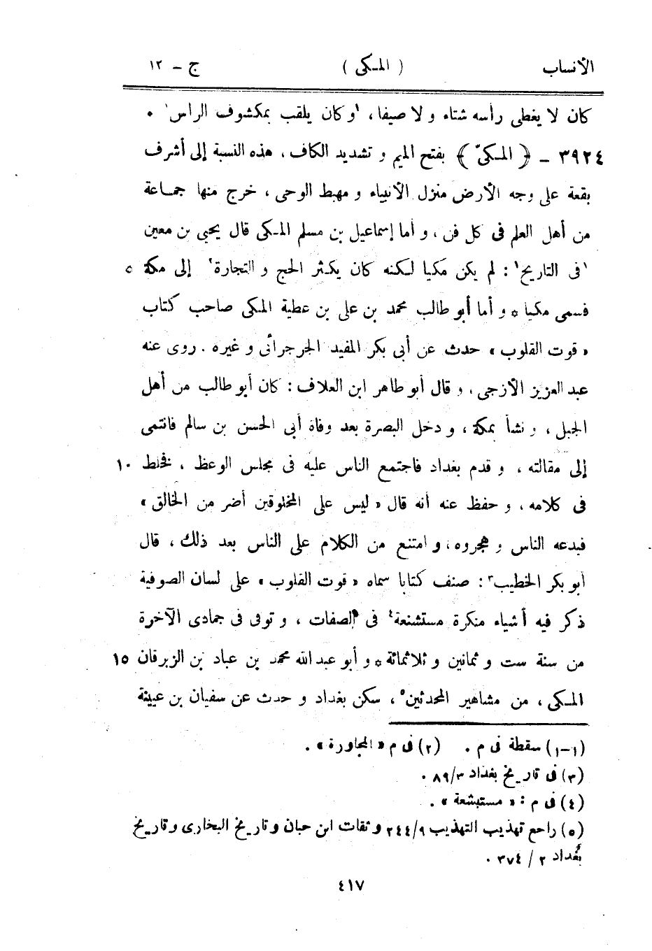 بفتح الميم وتشديد الكاف، هذه النسبة إلى أشرف بقعة على وجه الأرض منزل الأنبياء ومهبط الوحي، خرج منها جماعة من أهل العلم في كل فن، وأما إسماعيل بن مسلم المكيّ قال يحيى بن معين [1] في التاريخ [1] : لم يكن مكيا لكنه كان يكثر الحج والتجارة [2] إلى مكة فسمى مكيا وأما أبو طالب محمد بن على بن عطية المكيّ صاحب كتاب «قوت القلوب» حدث عن أبى بكر المفيد الجرجرائى وغيره، روى عنه عبد العزيز الأزجي، وقال أبو طاهر ابن العلاف: كان أبو طالب من أهل الجبل، ونشأ بمكة، ودخل البصرة بعد وفاة أبى الحسن بن سالم فانتمى إلى مقالته، وقدم بغداد فاجتمع الناس عليه في مجلس الوعظ، فخلط في كلامه، وحفظ عنه أنه قال «ليس على المخلوقين أضر من الخالق» فبدعه الناس وهجروه، وامتنع من الكلام على الناس بعد ذلك، قال أبو بكر الخطيب [3] : صنف كتابا سماه «قوت القلوب» على لسان الصوفية ذكر فيه أشياء منكرة مستشنعة [4] في الصفات، وتوفى في جمادى الآخرة من سنة ست وثمانين وثلاثمائة وأبو عبد الله محمد بن عباد بن الزبرقان المكيّ، من مشاهير المحدثين [5] ، سكن بغداد وحدث عن سفيان بن عيينة