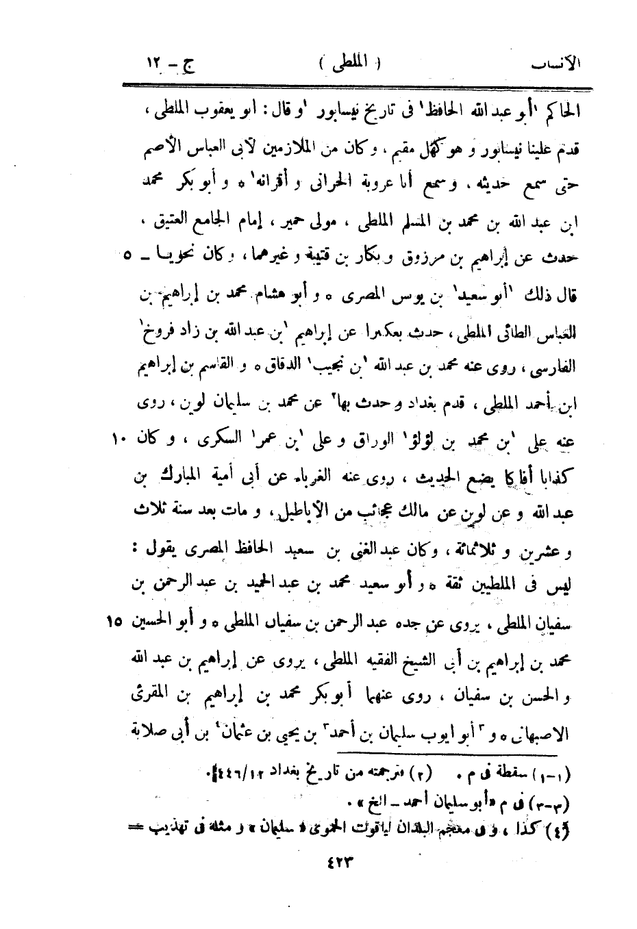 ليس في الملطيين ثقة وأبو سعيد محمد بن عبد الحميد بن عبد الرحمن بن سفيان الملطي، يروى عن جده عبد الرحمن بن سفيان الملطي وأبو الحسين محمد بن إبراهيم بن أبى الشيخ الفقيه الملطي، يروى عن إبراهيم بن عبد الله والحسن بن سفيان، روى عنهما أبو بكر محمد بن إبراهيم بن المقرئ الأصبهاني و [3] أبو أيوب سليمان بن أحمد [3] بن يحيى بن عثمان [4] بن أبى صلابة