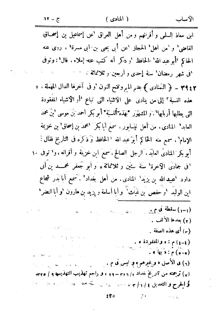 بضم الميم وفتح النون [2] وفي آخرها الدال المهملة، هذه النسبة [3] إلى من ينادى على الأشياء التي تباع [4] أو الأشياء المفقودة التي يطلبها أربابها [4] ، والمشهور [5] بهذه النسبة [5] أبو بكر أحمد بن موسى [1] بن محمد العابد [1] المنادي، من أهل نيسابور، سمع ابا بكر [1] محمد بن إسحاق [1] بن خزيمة الإمام [6] ، سمع منه الحاكم أبو عبد الله [1] الحافظ وذكره في التاريخ فقال: