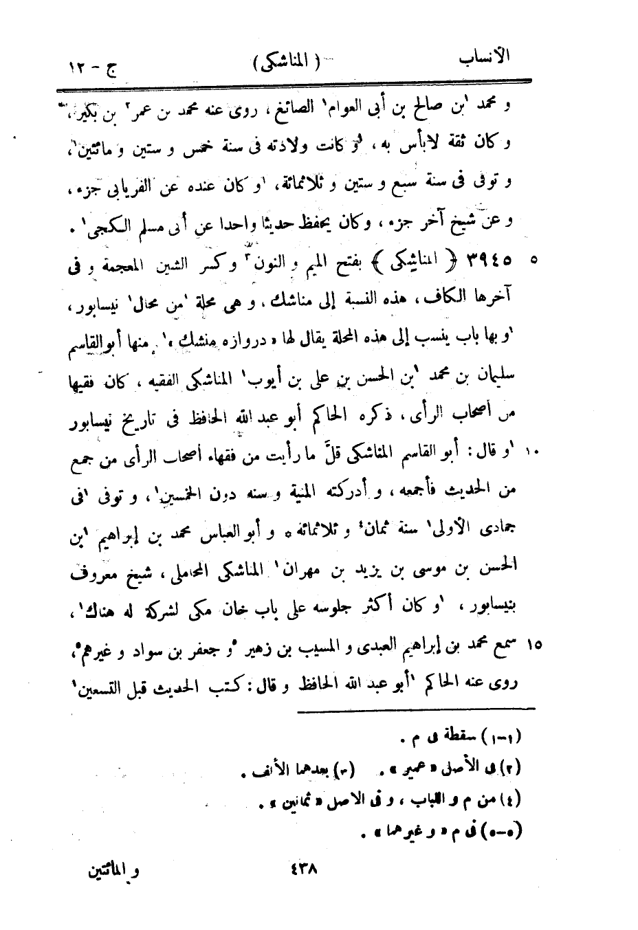 بفتح الميم والنون [3] وكسر الشين المعجمة وفي آخرها الكاف، هذه النسبة إلى مناشك، وهي محلة [1] من محال [1] نيسابور، [1] وبها باب ينسب إلى هذه المحلة يقال لها «دروازه منشك» [1] . منها أبو القاسم سليمان بن محمد [1] بن الحسن بن على بن أيوب [1] المناشكى الفقيه، كان فقيها من أصحاب الرأى، ذكره الحاكم أبو عبد الله الحافظ في تاريخ نيسابور [1] وقال:] أبو القاسم المناشكى قلّ ما رأيت من فقهاء أصحاب الرأى من جمع من الحديث فأجمعه، وأدركته المنية وسنه دون الخمسين [1] ، وتوفى [1] في جمادى الأولى [1] سنة ثمان [4] وثلاثمائة وأبو العباس محمد بن إبراهيم [1] بن الحسن بن موسى بن يزيد بن مهران [1] المناشكى المحاملي، شيخ معروف بنيسابور، [1] وكان أكثر جلوسه على باب خان مكي لشركة له هناك [1] ، سمع محمد بن إبراهيم العبديّ والمسيب بن زهير [5] وجعفر بن سواد وغيرهم [5] ، روى عنه الحاكم [1] أبو عبد الله الحافظ وقال: كتب الحديث قبل التسعين [1]