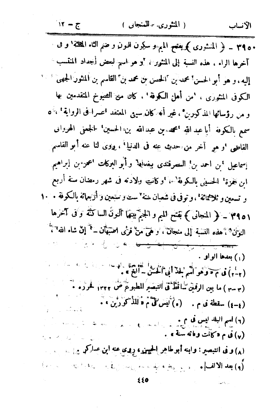 بفتح الميم وسكون النون وضم الثاء المثلثة [1] وفي آخرها الراء، هذه النسبة إلى المنثور، [2] وهو اسم لبعض أجداد المنتسب إليه، وهو أبو الحسن [2] محمد بن [3] الحسن بن محمد بن [3] القاسم بن المنثور الجهنيّ الكوفي المنثورى، [4] من أهل الكوفة [4] ، كان من الشيوخ المتقدمين بها ومن رؤسائها المذكورين [5] ، غير أنه كان سيء المعتقد [4] عسرا في الرواية [4] ، سمع بالكوفة أبا عبد الله [4] محمد بن عبد الله بن الحسين [4] الجعفي الهروانى القاضي [4] وهو آخر من حدث عنه في الدنيا [4] ، روى لنا عنه أبو القاسم إسماعيل [4] بن أحمد بن [4] السمرقندي ببغداد [6] وأبو البركات [4] عمر بن إبراهيم ابن حمزة [4] الحسيني بالكوفة [6] ، [4] وكانت ولادته في شهر رمضان سنة أربع وتسعين وثلاثمائة [4] ، وتوفى في شعبان سنة [7] ست وسبعين وأربعمائة بالكوفة