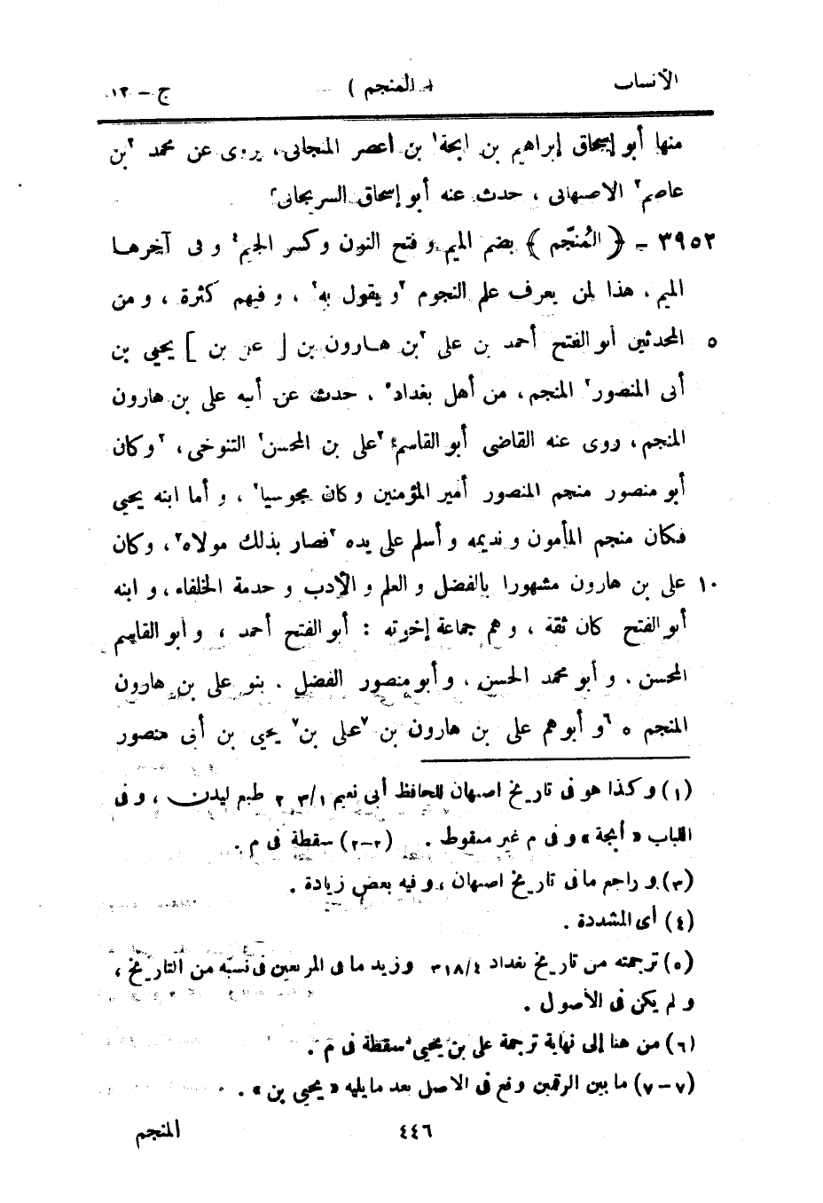 بضم الميم وفتح النون وكسر الجيم [4] وفي آخرها الميم، هذا لمن يعرف علم النجوم [2] ويقول به [2] ، وفيهم كثرة، ومن المحدثين أبو الفتح أحمد بن على [2] بن هارون بن [على بن] يحيى بن أبى المنصور [2] المنجم، من أهل بغداد [5] ، حدث عن أبيه على بن هارون المنجم، روى عنه القاضي أبو القاسم [2] على بن المحسن [2] التنوخي، [2] وكان أبو منصور منجم المنصور أمير المؤمنين وكان مجوسيا [2] ، وأما ابنه يحيى فكان منجم المأمون ونديمه وأسلم على يده [2] فصار بذلك مولاه [2] ، وكان على بن هارون مشهورا بالفضل والعلم والأدب وخدمة الخلفاء، وابنه أبو الفتح كان ثقة، وهم جماعة إخوته: أبو الفتح أحمد، وأبو القاسم المحسن، وأبو محمد الحسن، وأبو منصور الفضل، بنو على بن هارون المنجم [6] وأبو هم على بن هارون بن [7] على بن [7] يحيى بن أبى منصور
