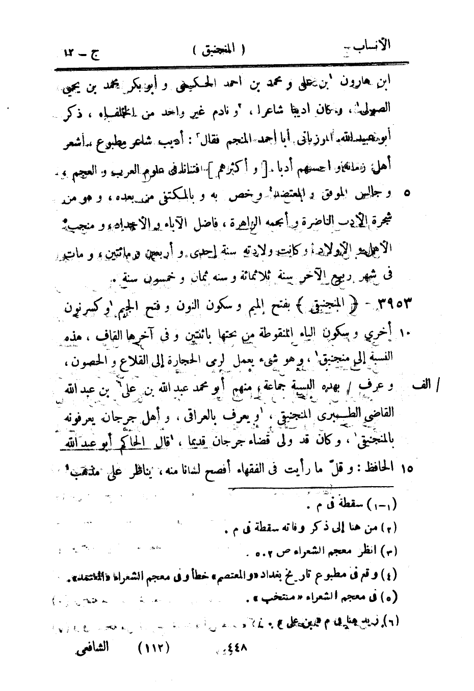 بفتح الميم وسكون النون وفتح الجيم [1] وكسر نون أخرى وسكون الياء المنقوطة من تحتها باثنتين وفي آخرها القاف، هذه النسبة إلى منجنيق [1] ، وهو شيء يعمل لرمي الحجارة إلى القلاع والحصون، وعرف/ بهذه النسبة جماعة، منهم أبو محمد عبد الله بن على [6] بن عبد الله القاضي الطبري المنجنيقى، [1] ويعرف بالعراقي، وأهل جرجان يعرفونه بالمنجنيقى [1] ، وكان قد ولى قضاء جرجان قديما، [1] قال الحاكم أبو عبد الله الحافظ: وقلّ ما رأيت في الفقهاء أفصح لسانا منه، يناظر على مذهب [1]