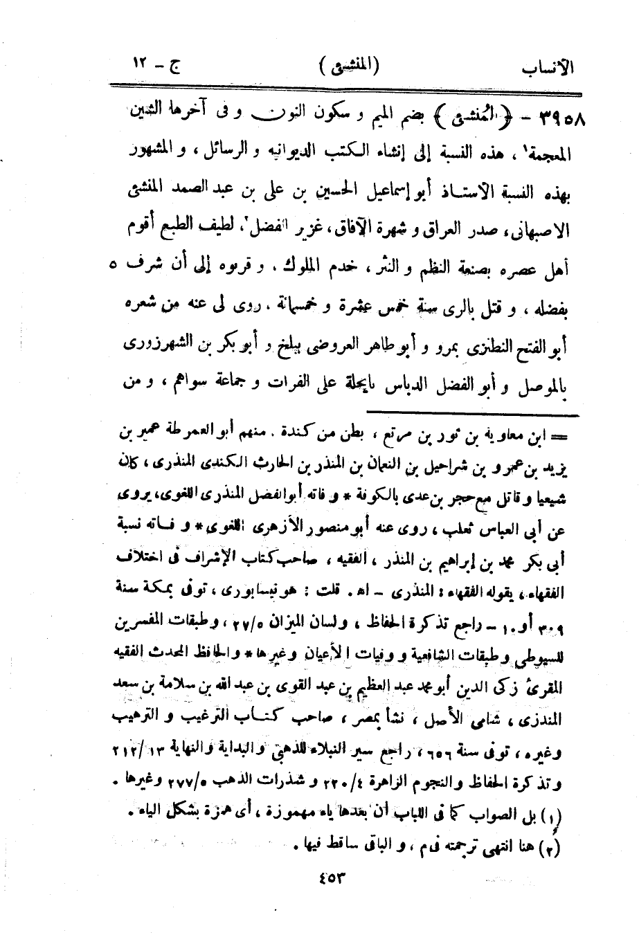 بضم الميم وسكون النون وفي آخرها الشين المعجمة [1] ، هذه النسبة إلى إنشاء الكتب الديوانيه والرسائل، والمشهور بهذه النسبة الأستاذ أبو إسماعيل الحسين بن على بن عبد الصمد المنشئ الأصبهاني، صدر العراق وشهرة الآفاق، غزير الفضل [2] ، لطيف الطبع أقوم أهل عصره بصنعة النظم والنثر، خدم الملوك، وقربوه إلى أن شرف بفضله، وقتل بالري سنة خمس عشرة وخمسمائة، روى لي عنه من شعره أبو الفتح النطنزي بمرو وأبو طاهر العروضي ببلخ وأبو بكر بن الشهرزوريّ بالموصل وأبو الفضل الدباس بايحلة على الفرات وجماعة سواهم، ومن