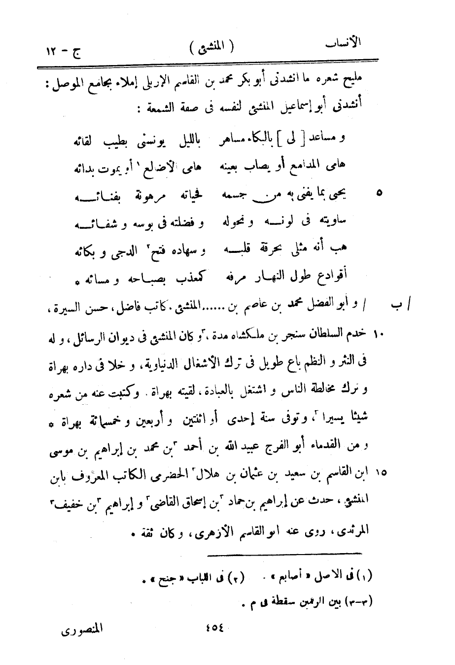 وأبو الفضل محمد بن عاصم بن ... المنشئ، كاتب فاضل، حسن السيرة، خدم السلطان سنجر بن ملك شاه مدة، [3] وكان المنشئ في ديوان الرسائل، وله في النثر والنظم باع طويل في ترك الأشغال الدنياوية، وخلا في داره بهراة وترك مخالطة الناس واشتغل بالعبادة، لقيته بهراة وكتبت عنه من شعره شيئا يسيرا [3] ، وتوفى سنة إحدى أو اثنتين وأربعين وخمسمائة بهراة ومن القدماء أبو الفرج عبيد الله بن أحمد [3] بن محمد بن إبراهيم بن موسى ابن القاسم بن سعيد بن عثمان بن هلال [3] الحضرميّ الكاتب المعروف بابن المنشئ، حدث عن إبراهيم بن حماد [3] بن إسحاق القاضي [3] وإبراهيم [3] بن خفيف [3] المرثدي، روى عنه أبو القاسم الأزهري، وكان ثقة.