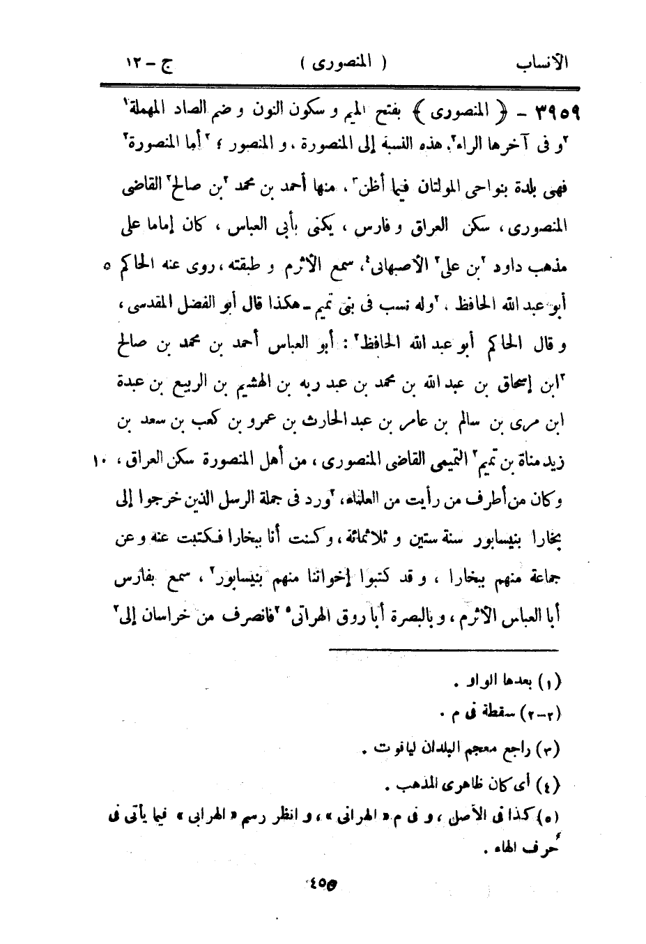 بفتح الميم وسكون النون وضم الصاد المهملة [1] [2] وفي آخرها الراء [2] ، هذه النسبة إلى المنصورة، والمنصور، [2] أما المنصورة [2] فهي بلدة بنواحي المولتان فيما أظن [3] ، منها أحمد بن محمد [2] بن صالح [2] القاضي المنصوري، سكن العراق وفارس، يكنى بأبي العباس، كان إماما على مذهب داود [2] بن على [2] الأصبهاني [4] ، سمع الأثرم وطبقته، روى عنه الحاكم أبو عبد الله الحافظ، [2] وله نسب في بنى تميم- هكذا قال أبو الفضل المقدسي، وقال الحاكم أبو عبد الله الحافظ [2] : أبو العباس أحمد بن محمد بن صالح [2] ابن إسحاق بن عبد الله بن محمد بن عبد ربه بن الهشيم بن الربيع بن عبدة ابن مري بن سالم بن عامر بن عبد الحارث بن عمرو بن كعب بن سعد بن زيد مناة بن تميم [2] التميمي القاضي المنصوري، من أهل المنصورة سكن العراق، وكان من أطراف من رأيت من العلماء، [2] ورد في جملة الرسل الذين خرجوا إلى بخارا بنيسابور سنة ستين وثلاثمائة، وكنت أنا ببخارا فكتبت عنه وعن جماعة منهم ببخارا، وقد كتبوا إخواننا منهم بنيسابور [2] ، سمع بفارس أبا العباس الأثرم، وبالبصرة أبا روق الهراتى [5] [2] فانصرف من خراسان إلى [2]