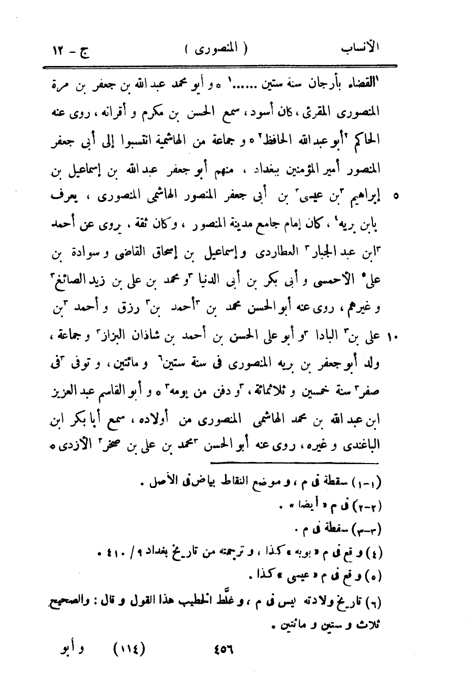 [1] القضاء بأرجان سنة ستين ... [1] وأبو محمد عبد الله بن جعفر بن مرة المنصوري المقرئ، كان أسود، سمع الحسن بن مكرم وأقرانه، روى عنه الحاكم [2] أبو عبد الله الحافظ [2] وجماعة من الهاشمية انتسبوا إلى أبى جعفر المنصور أمير المؤمنين ببغداد، منهم أبو جعفر عبد الله بن إسماعيل بن إبراهيم [3] بن عيسى [3] بن أبى جعفر المنصور الهاشمي المنصوري، يعرف بابن بريه [4] ، كان إمام جامع مدينة المنصور، وكان ثقة، يروى عن أحمد [3] ابن عبد الجبار [3] العطاردي وإسماعيل بن إسحاق القاضي وسوادة بن على [5] الأحمسي وأبى بكر بن أبى الدنيا [3] ومحمد بن على بن زيد الصائغ [3] وغيرهم، روى عنه أبو الحسن محمد بن [3] أحمد بن [3] رزق وأحمد [3] بن على بن [3] البادا [3] وأبو على الحسن بن أحمد بن شاذان البزاز [3] وجماعة، ولد أبو جعفر بن برية المنصوري في سنة ستين [6] ومائتين، وتوفى [3] في صفر [3] سنة خمسين وثلاثمائة، [3] ودفن من يومه [3] وأبو القاسم عبد العزيز ابن عبد الله بن محمد الهاشمي المنصوري من أولاده، سمع أبا بكر ابن الباغندي وغيره، روى عنه أبو الحسن [3] محمد بن على بن صخر [3] الأزدي