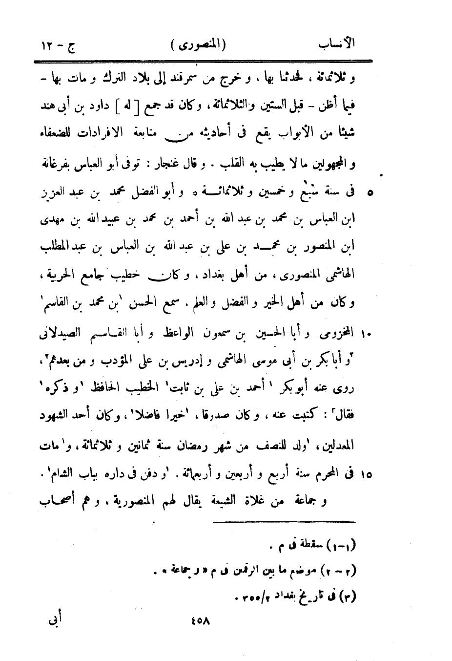 وثلاثمائة، فحدثنا بها، وخرج من سمرقند إلى بلاد الترك ومات بها- فيما أظن- قبل الستين والثلاثمائة، وكان قد جمع [له] داود بن أبى هند شيئا من الأبواب يقع في أحاديثه من متابعة الافرادات للضعفاء والمجهولين ما لا يطيب به القلب. وقال غنجار: توفى أبو العباس بفرغانة في سنة سبع وخمسين وثلاثمائة وأبو الفضل محمد بن عبد العزيز ابن العباس بن محمد بن عبد الله بن أحمد بن محمد بن عبيد الله بن مهدي ابن المنصور بن محمد بن على بن عبد الله بن العباس بن عبد المطلب الهاشمي المنصوري، من أهل بغداد، وكان خطيب جامع الحربية، وكان من أهل الخير والفضل والعلم، سمع الحسن [1] بن محمد بن القاسم [1] المخزومي وأبا الحسين بن سمعون الواعظ وأبا القاسم الصيدلاني [2] وأبا بكر بن أبى موسى الهاشمي وإدريس بن على المؤدب ومن بعدهم [2] ، روى عنه أبو بكر [1] أحمد بن على بن ثابت [1] الخطيب الحافظ [1] وذكره [1] فقال [3] : كتبت عنه، وكان صدوقا، [1] خيرا فاضلا [1] ، وكان أحد الشهود المعدلين، [1] ولد للنصف من شهر رمضان سنة ثمانين وثلاثمائة، و [1] مات في المحرم سنة أربع وأربعين وأربعمائة، [1] ودفن في داره بباب الشام [1] .