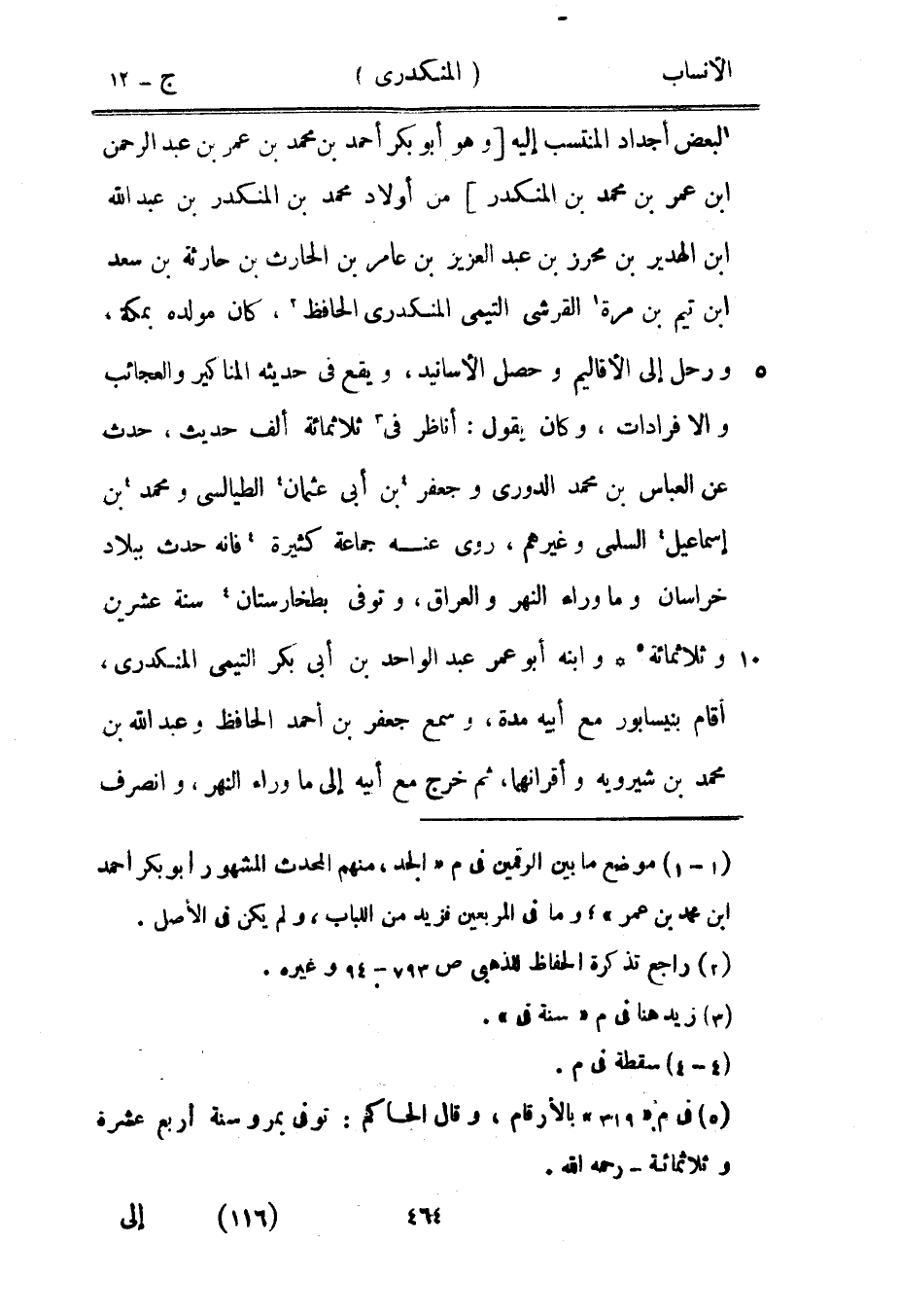 [1] لبعض أجداد المنتسب إليه [وهو أبو بكر أحمد بن محمد بن عمر بن عبد الرحمن ابن عمر بن محمد بن المنكدر] من أولاد محمد بن المنكدر بن عبد الله ابن الهدير بن محرز بن عبد العزيز بن عامر بن الحارث بن حارثة بن سعد ابن تيم بن مرة [1] القرشي التيمي المنكدرى الحافظ [2] ، كان مولده بمكة، ورحل إلى الأقاليم وحصل الأسانيد، ويقع في حديثه المناكير والعجائب والا فرادات، وكان يقول: أناظر في [3] ثلاثمائة ألف حديث، حدث عن العباس بن محمد الدوري وجعفر [4] بن أبى عثمان [4] الطيالسي ومحمد [4] بن إسماعيل [4] السلمي وغيرهم، روى عنه جماعة كثيرة [4] فإنه حدث ببلاد خراسان وما وراء النهر والعراق، وتوفى بطخارستان [4] سنة عشرين وثلاثمائة [5] وابنه أبو عمر عبد الواحد بن أبى بكر التيمي المنكدرى، أقام بنيسابور مع أبيه مدة، وسمع جعفر بن أحمد الحافظ وعبد الله بن محمد بن شيرويه وأقرانهما، ثم خرج مع أبيه إلى ما وراء النهر، وانصرف