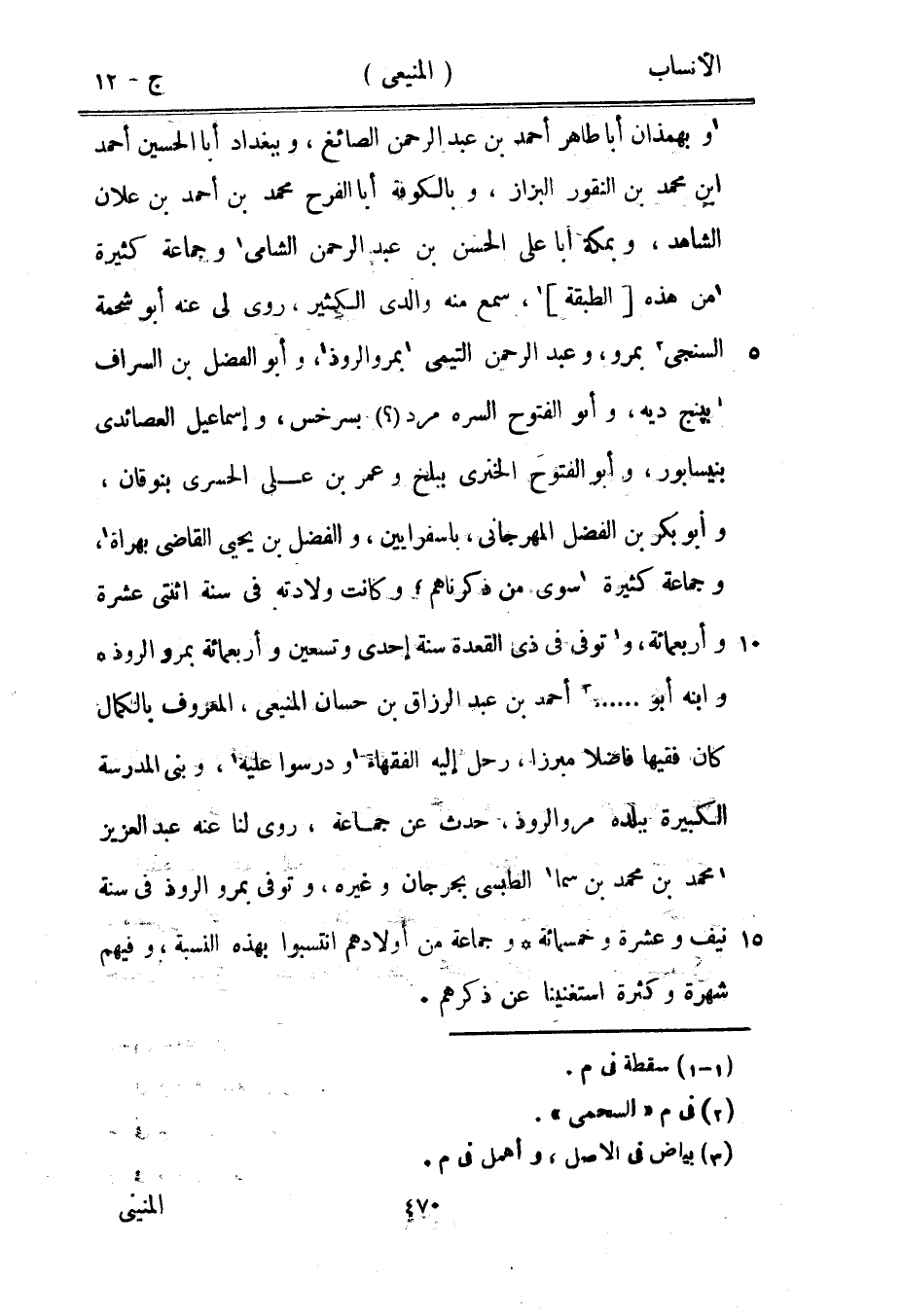 [1] وبهمذان أبا طاهر أحمد بن عبد الرحمن الصائغ، وببغداد أبا الحسين أحمد ابن محمد بن النقور البزاز، وبالكوفة أبا الفرح محمد بن أحمد بن علان الشاهد، وبمكة أبا على الحسن بن عبد الرحمن الشامي [1] وجماعة كثيرة [1] من هذه [الطبقة] [1] ، سمع منه والدي الكثير، روى لي عنه أبو شحمة السنجى [2] بمرو، وعبد الرحمن التيمي [1] بمروالروذ [1] ، وأبو الفضل بن السراف بپنج ديه، وأبو الفتوح السره مرد (؟) بسرخس، وإسماعيل العصائدى بنيسابور، وأبو الفتوح الخنرى ببلخ وعمر بن على الحسرى بنوقان، وأبو بكر بن الفضل المهرجانى، بأسفرايين، والفضل بن يحيى القاضي بهراة [1] ، وجماعة كثيرة [1] سوى من ذكرناهم، وكانت ولادته في سنة اثنتي عشرة وأربعمائة، و [1] توفى في ذي القعدة سنة إحدى وتسعين وأربعمائة بمروالروذ وابنه أبو ... [3] أحمد بن عبد الرزاق بن حسان المنيعى، المعروف بالكمال كان فقيها فاضلا مبرزا، رحل إليه الفقهاء [1] ودرسوا عليه [1] ، وبنى المدرسة الكبيرة ببلده مروالروذ، حدث عن جماعة، روى لنا عنه عبد العزيز [1] محمد بن محمد بن سما [1] الطبسي بجرجان وغيره، وتوفى بمروالروذ في سنة نيف وعشرة وخمسمائة وجماعة من أولادهم انتسبوا بهذه النسبة، وفيهم شهرة وكثرة استغنينا عن ذكرهم.
