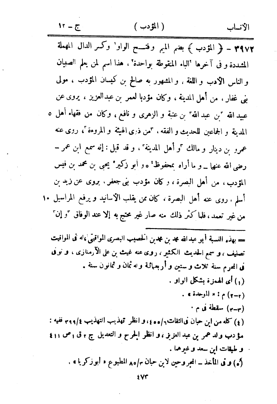 بضم الميم وفتح الواو [1] وكسر الدال المهملة المشددة وفي آخرها [2] الباء المنقوطة بواحدة [2] ، هذا اسم لمن يعلم الصبيان والناس الأدب واللغة، والمشهور به صالح بن كيسان المؤدب، مولى بنى غفار، من أهل المدينة، وكان مؤدبا لعمر بن عبد العزيز، يروى عن عبيد الله [3] بن عبد الله [3] بن عتبة والزهري ونافع، وكان من فقهاء أهل المدينة والجماعين للحديث والفقه، [3] من ذوى الهيئة والمروءة [3] ، روى عنه عمرو بن دينار ومالك [3] وأهل المدينة [3] ، وقد قيل: إنه سمع ابن عمر- رضى الله عنهما- وما أراه بمحفوظ [4] وأبو زكير [5] يحيى بن محمد بن قيس المؤدب، من أهل البصرة، وكان مؤدب بنى جعفر، يروى عن زيد بن أسلم، روى عنه أهل البصرة، كان ممن يقلب الأسانيد ويرفع المراسيل من غير تعمد، فلما كثر ذلك منه صار غير محتج به إلا عند الوفاق [3] وإن [3]