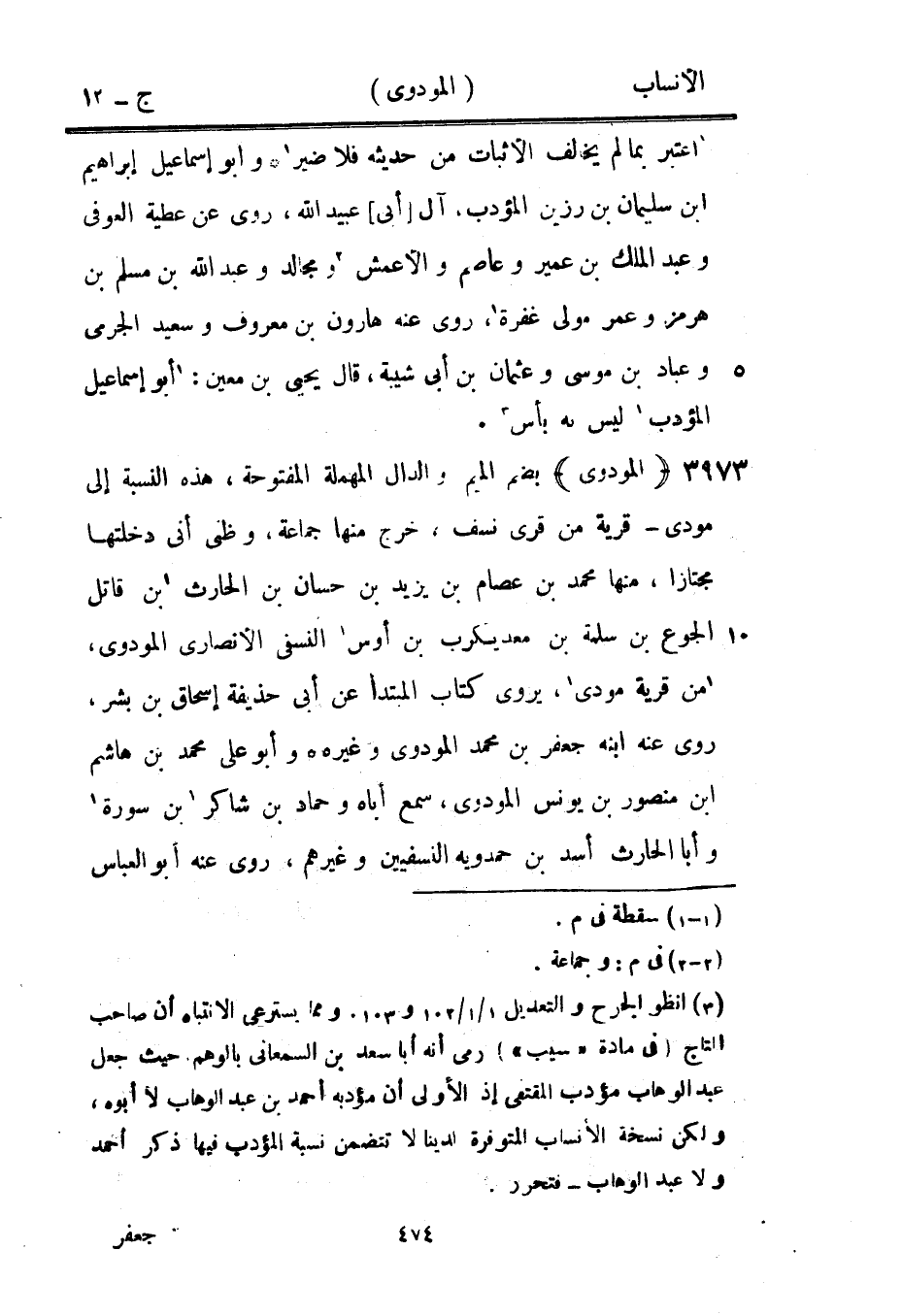 [3] انظر الجرح والتعديل 1/ 1/ 102 و 103. ومما يسترعى الانتباه أن صاحب التاج (في مادة «سيب» ) رمى أنه أبا سعيد بن السمعاني بالوهم حيث جعل عبد الوهاب مؤدب المقتفى إذ الأولى أن مؤدبه أحمد بن عبد الوهاب لا أبوه، ولكن نسخة الأنساب المتوفرة لدينا لا تتضمن نسبة المؤدب فيها ذكر أحمد ولا عبد الوهاب- فتحرر.