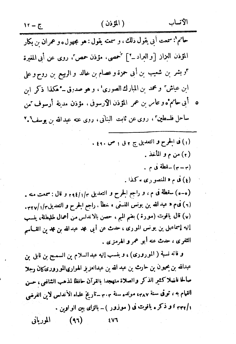 حاتم [1] : سمعت أبى يقول ذلك، وسمعته يقول: هو مجهول وعمران بن بكار المؤذن البزاز [والبراد-[2]] [3] حمصى، مؤذن حمص [3] ، روى عن أبى المغيرة [3] وبشر بن شعيب بن أبى حمزة وعصام بن خالد والربيع بن روح وعلى ابن عياش [3] ومحمد بن المبارك الصوري [4] ، وهو صدوق-[5] هكذا ذكر ابن أبى حاتم [5] وعامر بن عمر المؤذن الأرسوفي، مؤذن مدينة أرسوف [3] من ساحل فلسطين [3] ، روى عن ثابت البناني، روى عنه عبد الله بن يوسف [6] . [7]