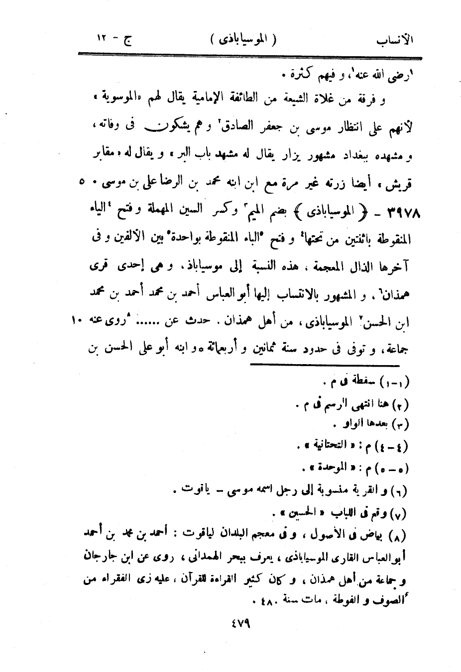 [8] بياض في الأصول، وفي معجم البلدان لياقوت: أحمد بن محمد بن أحمد أبو العباس القاري الموسياباذى، يعرف ببحر الهمذانيّ، روى عن ابن جارجان وجماعة من أهل همذان، وكان كثير القراءة للقرآن، عليه زي الفقراء من الصوف والفوطة، مات سنة 480.