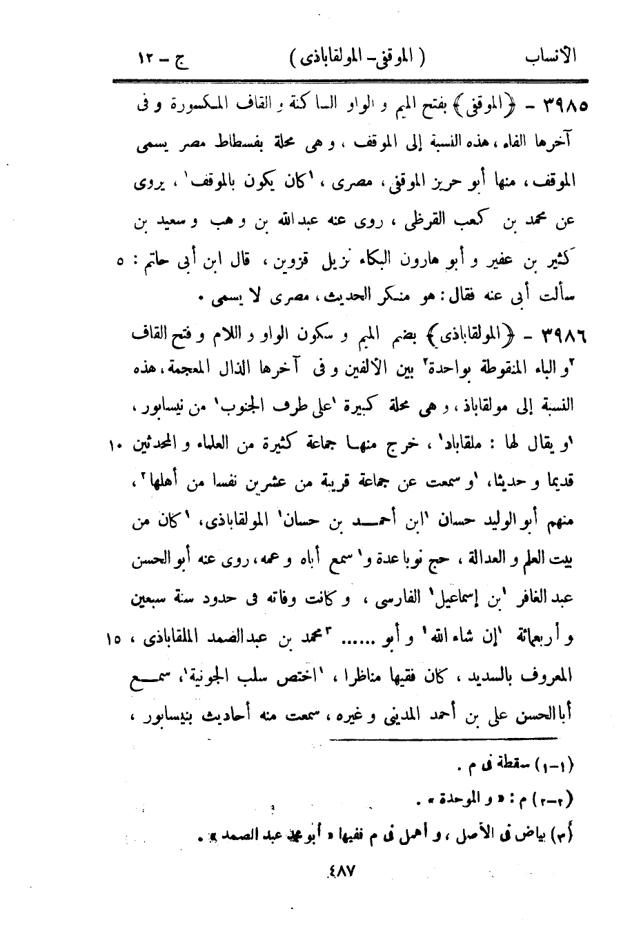 بضم الميم وسكون الواو واللام وفتح القاف [2] والباء المنقوطة بواحدة [2] بين الألفين وفي آخرها الذال المعجمة، هذه النسبة إلى مولقاباذ، وهي محلة كبيرة [1] على طرف الجنوب [1] من نيسابور، [1] ويقال لها: ملقاباذ [1] ، خرج منها جماعة كثيرة من العلماء والمحدثين قديما وحديثا، [1] وسمعت عن جماعة قريبة من عشرين نفسا من أهلها [2] ، منهم أبو الوليد حسان [1] ابن أحمد بن حسان [1] المولقاباذى، [1] كان من بيت العلم والعدالة، حج نوبا عدة و [1] سمع أباه وعمه، روى عنه أبو الحسن عبد الغافر [1] بن إسماعيل [1] الفارسي، وكانت وفاته في حدود سنة سبعين وأربعمائة [1] إن شاء الله [1] وأبو ... [3] محمد بن عبد الصمد الملقاباذى، المعروف بالسديد، كان فقيها مناظرا، [1] اختص سلب الجونية [1] ، سمع أبا الحسن على بن أحمد المديني وغيره، سمعت منه أحاديث بنيسابور،