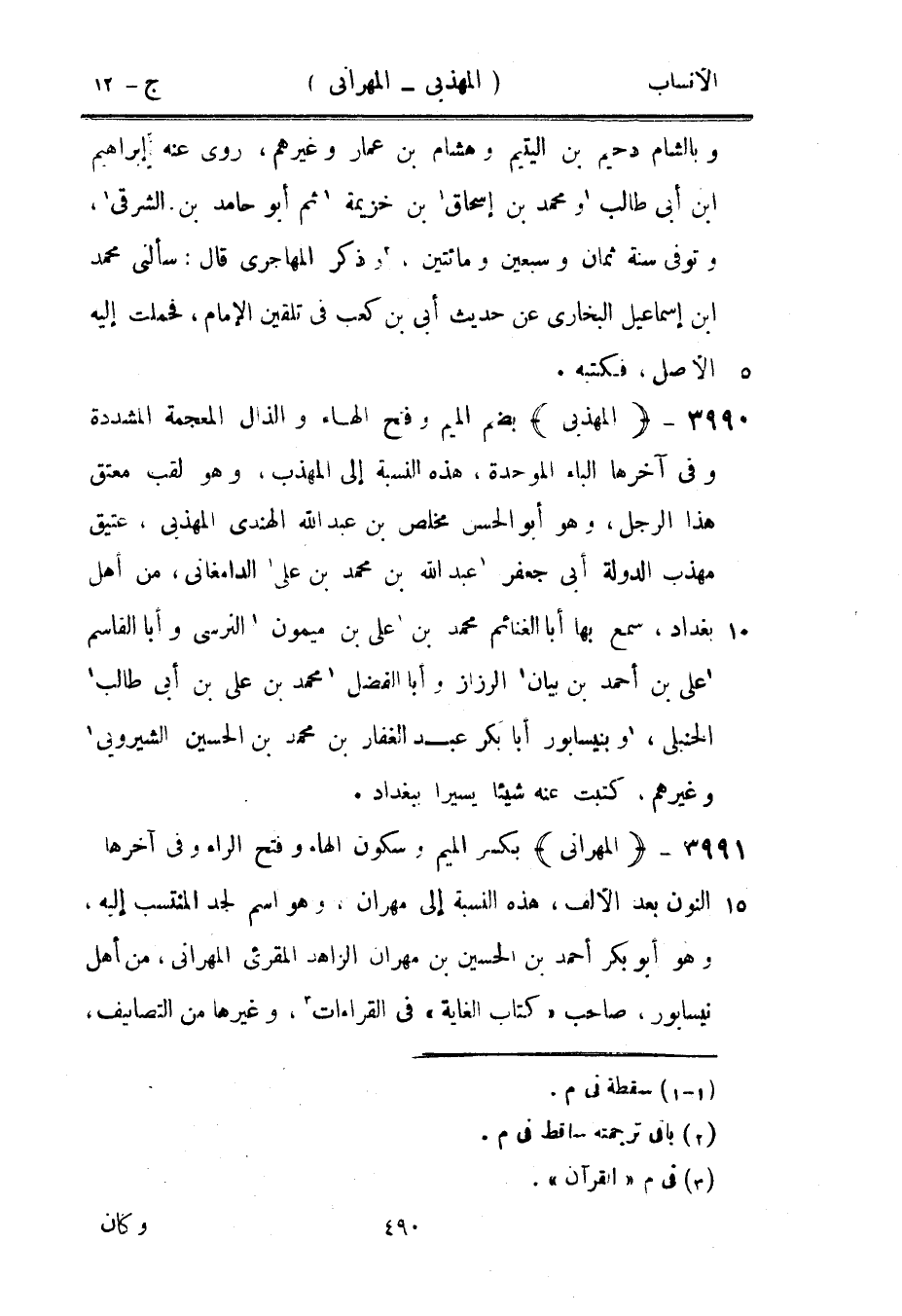 بكسر الميم وسكون الهاء وفتح الراء وفي آخرها النون بعد الألف، هذه النسبة إلى مهران، وهو اسم لجد المنتسب إليه، وهو أبو بكر أحمد بن الحسين بن مهران الزاهد المقرئ المهرانى، من أهل نيسابور، صاحب «كتاب الغاية» في القراءات [3] ، وغيرها من التصانيف،