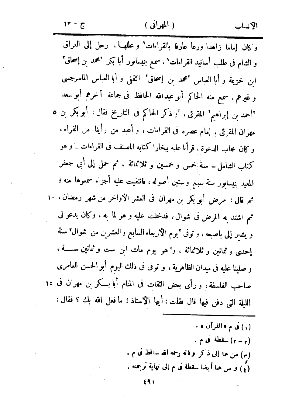 وكان إماما زاهدا ورعا عارفا بالقراءات [1] وعللها، رحل إلى العراق والشام في طلب أسانيد القراءات [1] ، سمع بنيسابور أبا بكر [2] محمد بن إسحاق [2] ابن خزيمة وأبا العباس [2] محمد بن إسحاق [2] الثقفي وأبا العباس الماسرجسي وغيرهم، سمع منه الحاكم أبو عبد الله الحافظ في جماعة آخرهم أبو سعد [2] أحمد بن إبراهيم [2] المقرئ، [3] وذكر الحاكم في التاريخ فقال: أبو بكر بن مهران المقرئ، إمام عصره في القراءات، وأعبد من رأينا من القراء، وكان مجاب الدعوة، قرأنا عليه ببخارا كتابه المصنف في القراءات- وهو كتاب الشامل- سنة خمس وخمسين وثلاثمائة، ثم حمل إلى أبى جعفر المعيد بنيسابور سنة سبع وستين أصوله، فانتقيت عليه أجزاء سمعوها منه، ثم قال: مرض أبو بكر بن مهران في العشر الأواخر من شهر رمضان، ثم اشتد به المرض في شوال، فدخلت عليه وهو لما به، وكان يدعو لي ويشير إلى بإصبعه، وتوفى [2] يوم الأربعاء السابع والعشرين من شوال [2] سنة إحدى وثمانين وثلاثمائة، و [4] هو يوم مات ابن ست وثمانين سنة، وصلينا عليه في ميدان الظاهرية، وتوفى في ذلك اليوم أبو الحسن العامري صاحب الفلسفة، ورأى بعض الثقات في المنام أبا بكر بن مهران في الليلة التي دفن فيها قال فقلت: أيها الأستاذ! ما فعل الله بك؟ فقال: