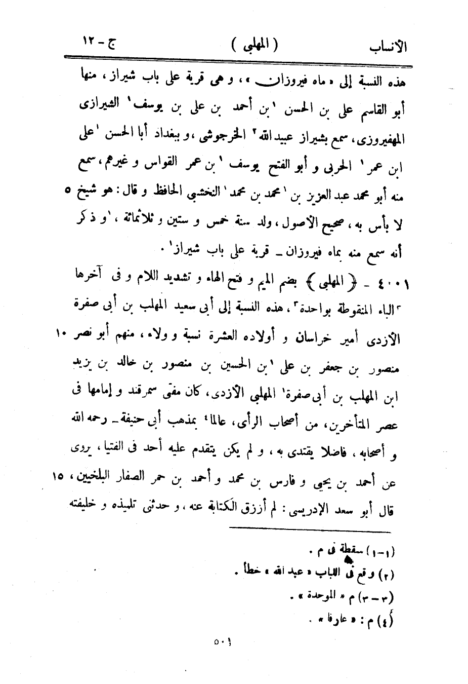 بضم الميم وفتح الهاء وتشديد اللام وفي آخرها [3] الباء المنقوطة بواحدة [3] ، هذه النسبة إلى أبى سعيد المهلب بن أبى صفرة الأزدي أمير خراسان وأولاده العشرة نسبة وولاء، منهم أبو نصر منصور بن جعفر بن على [1] بن الحسين بن منصور بن خالد بن يزيد ابن المهلب بن أبى صفرة [1] المهلبي الأزدي، كان مفتى سمرقند وإمامها في عصر المتأخرين، من أصحاب الرأى، عالما [4] بمذهب أبى حنيفة- رحمه الله وأصحابه، فاضلا يقتدى به، ولم يكن يتقدم عليه أحد في الفتيا، يروى عن أحمد بن يحيى وفارس بن محمد وأحمد بن حمر الصفار البلخيين، قال أبو سعد الإدريسي: لم أرزق الكتابة عنه، وحدثني تلميذه وخليفته