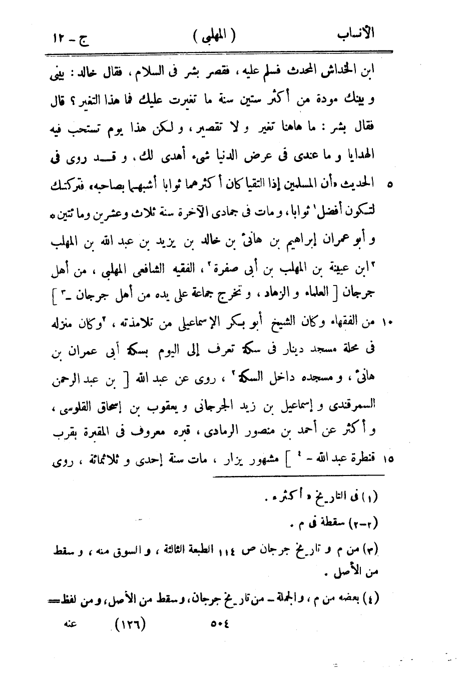 ابن الخداش المحدث فسلم عليه، فقصر بشر في السلام، فقال خالد: بيني وبينك مودة من أكثر ستين سنة ما تغيرت عليك فما هذا التغير؟ قال فقال بشر: ما هاهنا تغير ولا تقصير، ولكن هذا يوم تستحب فيه الهدايا وما عندي في عرض الدنيا شيء أهدى لك، وقد روى في الحديث «أن المسلمين إذا التقيا كان أكثرهما ثوابا أشبهما بصاحبه» فتركتك لتكون أفضل [1] ثوابا، ومات في جمادى الآخرة سنة ثلاث وعشرين ومائتين وأبو عمران إبراهيم بن هانئ بن خالد بن يزيد بن عبد الله بن المهلب [2] ابن عيينة بن المهلب بن أبى صفرة [2] ، الفقيه الشافعيّ المهلبي، من أهل جرجان [العلماء والزهاد، وتخرج جماعة على يديه من أهل جرجان-[3]] من الفقهاء وكان الشيخ أبو بكر الإسماعيلي من تلامذته، [2] وكان منزله في محلة مسجد دينار في سكة تعرف إلى اليوم بسكة أبى عمران بن هانئ، ومسجده داخل السكة [2] ، روى عن عبد الله [بن عبد الرحمن السمرقندي وإسماعيل بن زيد الجرجاني ويعقوب بن إسحاق القلوسي، وأكثر عن أحمد بن منصور الرمادي، قبره معروف في المقبرة بقرب قنطرة عبد الله-[4]] مشهور يزار، مات سنة إحدى وثلاثمائة، روى