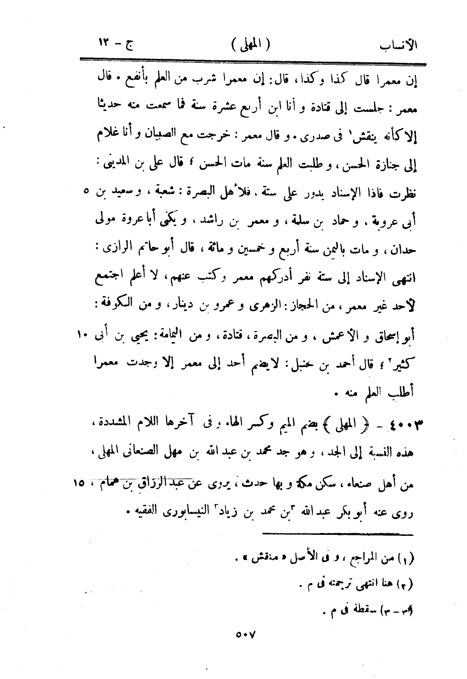 نظرت فإذا الإسناد يدور على ستة، فلأهل البصرة: شعبة، وسعيد بن أبى عروبة، وحماد بن سلمة، ومعمر بن راشد، ويكنى أبا عروة مولى حدان، ومات باليمن سنة أربع وخمسين ومائة، قال أبو حاتم الرازيّ: