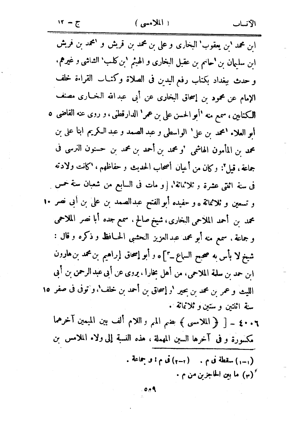 شيخ لا بأس به صحيح السماع-[3]] وأبو إسحاق إبراهيم بن محمد بن هارون ابن حمد بن سلمة الملاحمى، من أهل بخارا، يروى عن أبى عبد الرحمن بن أبى الليث وعمر بن محمد بن بحير [1] وإسحاق بن أحمد بن خلف [1] ، وتوفى في صفر سنة اثنتين وستين وثلاثمائة.