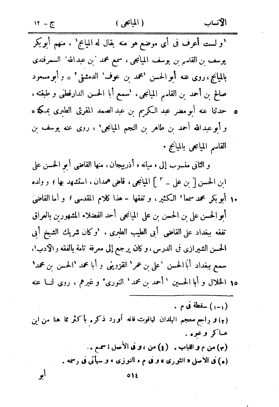 [1] ولست أعرف في أي موضع هو منه يقال له الميانج [1] ، منهم أبو بكر يوسف بن القاسم بن يوسف الميانجى، سمع محمد [1] بن عبد الله [1] السمرقندي بالميانج، روى عنه أبو الحسن [1] محمد بن عوف [1] الدمشقيّ [2] وأبو مسعود صالح بن أحمد بن القاسم الميانجى، [1] سمع أبا الحسن الدار قطنى وطبقته، حدثنا عنه أبو مضر عبد الكريم بن عبد الصمد المقرئ الطبري بمكة وأبو عبد الله أحمد بن طاهر بن النجم الميانجى [1] ، روى عنه يوسف بن القاسم الميانجى بالميانج.
