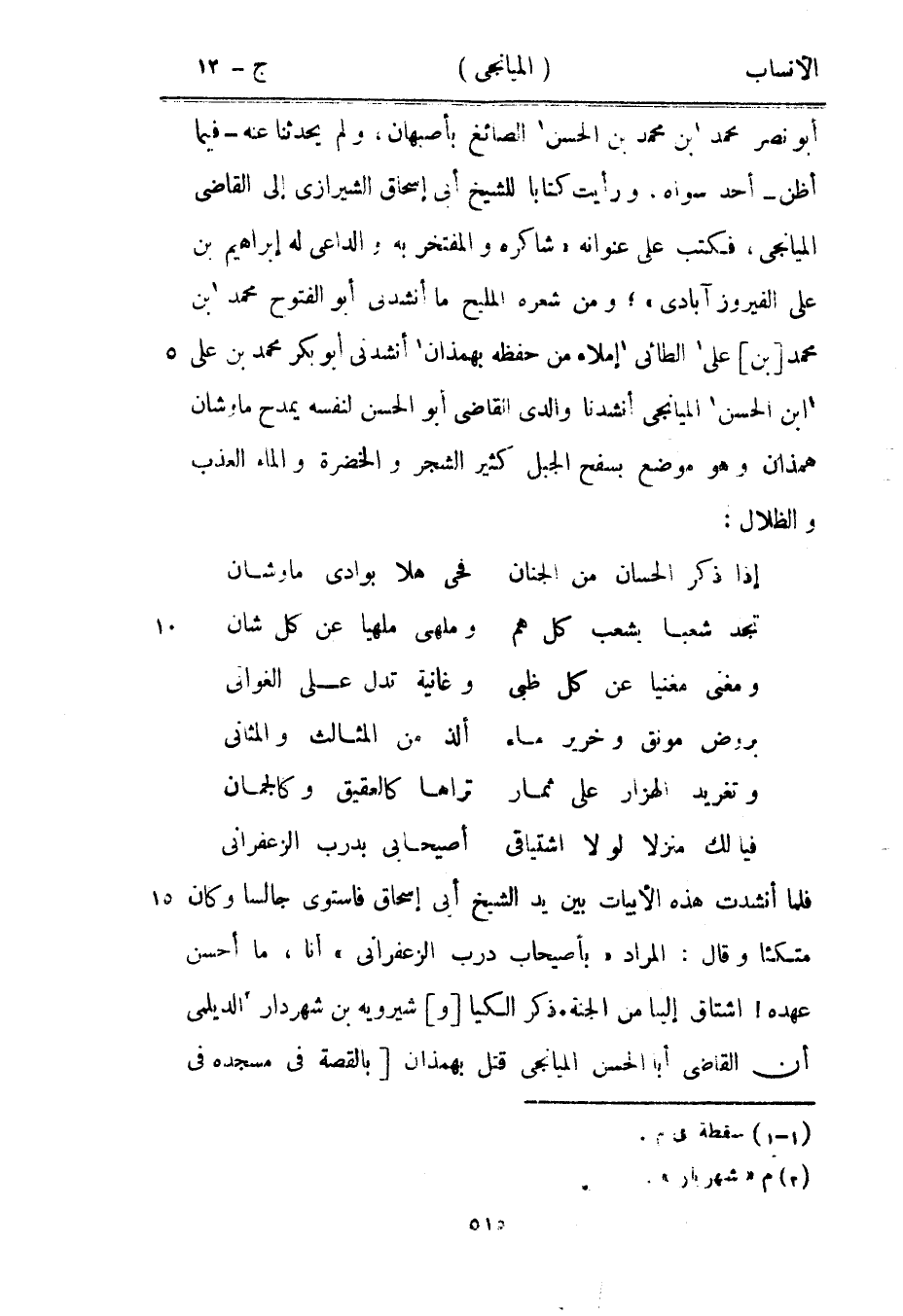 أبو نصر محمد [1] بن محمد بن الحسن [1] الصائغ بأصبهان، ولم يحدثنا عنه- فيما أظن- أحد سواه، ورأيت كتابا للشيخ أبى إسحاق الشيرازي إلى القاضي الميانجى، فكتب على عنوانه «شاكره والمفتخر به والداعي له إبراهيم بن على الفيروزآبادي» ، ومن شعره المليح ما أنشدنى أبو الفتوح محمد [1] بن محمد [بن] على [1] الطائي [1] إملاء من حفظه بهمذان [1] أنشدنى أبو بكر محمد بن على [1] ابن الحسن [1] الميانجى أنشدنا والدي القاضي أبو الحسن لنفسه يمدح ماوشان همذان وهو موضع بسفح الجبل كثير الشجر والخضرة والماء العذب والظلال: