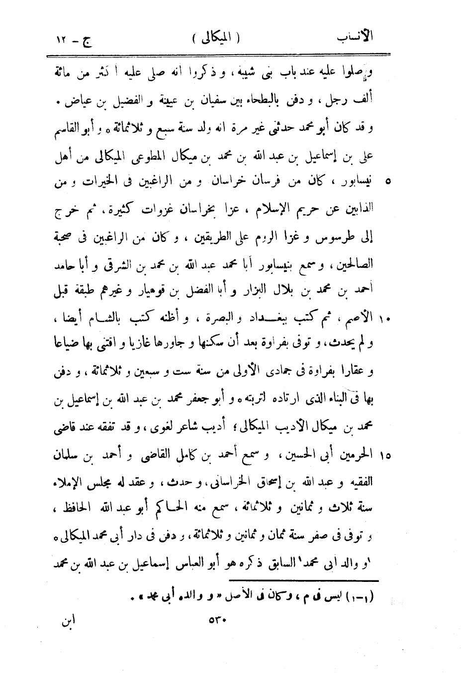 وقد كان أبو محمد حدثني غير مرة انه ولد سنة سبع وثلاثمائة وأبو القاسم على بن إسماعيل بن عبد الله بن محمد بن ميكال المطوعي الميكالى من أهل نيسابور، كان من فرسان خراسان ومن الراغبين في الخيرات ومن الذابين عن حريم الإسلام، غزا بخراسان غزوات كثيرة، ثم خرج إلى طرسوس وغزا الروم على الطريقين، وكان من الراغبين في صحبة الصالحين، وسمع بنيسابور أبا محمد عبد الله بن محمد بن الشرقي وأبا حامد أحمد بن محمد بن بلال البزار وأبا الفضل بن قوهيار وغيرهم طبقة قبل الأصم، ثم كتب ببغداد والبصرة، وأظنه كتب بالشام أيضا، ولم يحدث، وتوفى بفراوة بعد أن سكنها وجاورها غازيا واقتنى بها ضياعا وعقارا بفراوة في جمادى الأولى من سنة ست وسبعين وثلاثمائة، ودفن بها في البناء الّذي ارتاده لتربته وأبو جعفر محمد بن عبد الله بن إسماعيل بن محمد بن ميكال الأديب الميكالى، أديب شاعر لغويّ، وقد تفقه عند قاضى الحرمين أبى الحسين، وسمع أحمد بن كامل القاضي وأحمد بن سلمان الفقيه وعبد الله بن إسحاق الخراساني، وحدث، وعقد له مجلس الإملاء سنة ثلاث وثمانين وثلاثمائة، سمع منه الحاكم أبو عبد الله الحافظ، وتوفى في صفر سنة ثمان وثمانين وثلاثمائة، ودفن في دار أبى محمد الميكالى [1] ووالد أبى محمد [1] السابق ذكره هو أبو العباس إسماعيل بن عبد الله بن محمد