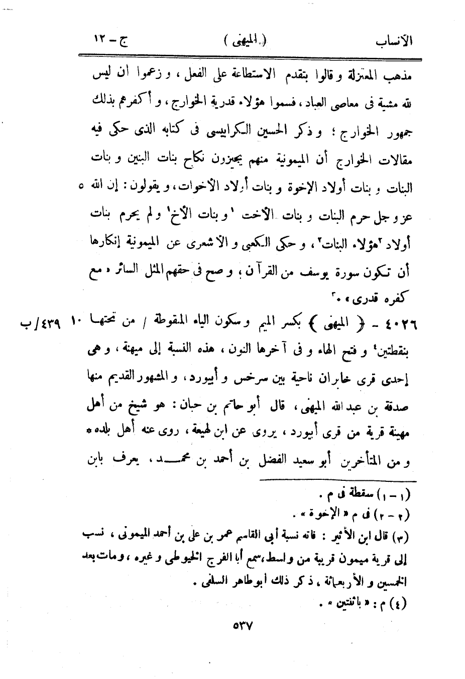 بكسر الميم وسكون الياء المنقوطة/ من تحتها بنقطتين [4] وفتح الهاء وفي آخرها النون، هذه النسبة إلى ميهنة، وهي إحدى قرى خابران ناحية بين سرخس وأبيورد، والمشهور القديم منها صدقة بن عبد الله الميهنى، قال أبو حاتم بن حبان: هو شيخ من أهل مهينة قرية من قرى أبيورد، يروى عن ابن لهيعة، روى عنه أهل بلده ومن المتأخرين أبو سعيد الفضل بن أحمد بن محمد، يعرف بابن