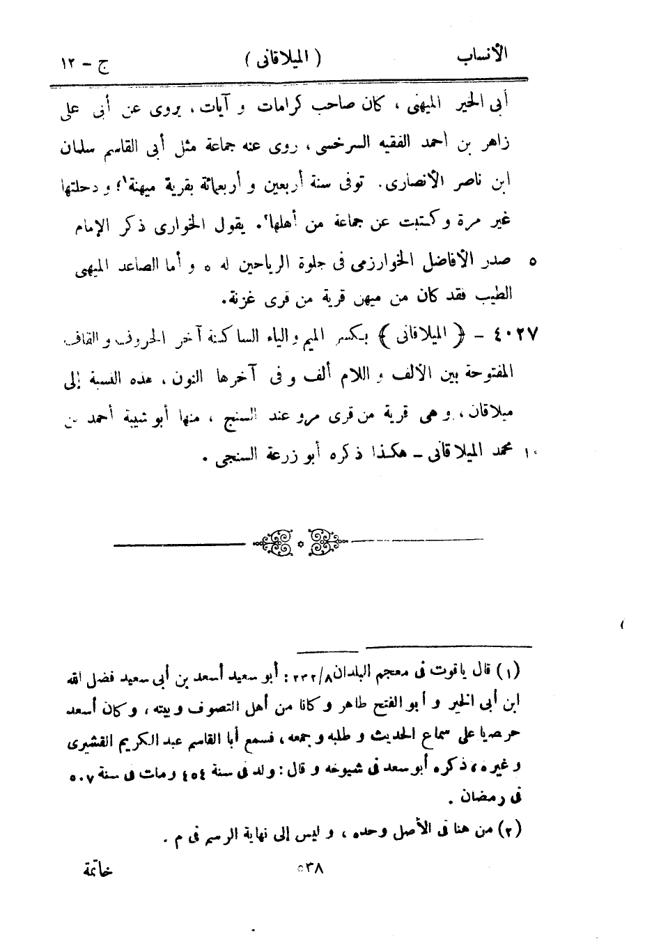 [1] قال ياقوت في معجم البلدان 8/ 232: أبو سعيد أسعد بن أبى سعيد فضل الله ابن أبى الخير وأبو الفتح طاهر وكانا من أهل التصوف وبيته، وان أسعد حريصا على سماع الحديث وطلبه وجمعه، فسمع أبا القاسم عبد الكريم القشيري وغيره، ذكره أبو سعد في شيوخه وقال: ولد في سنة 454 ومات في سنة 507 في رمضان.