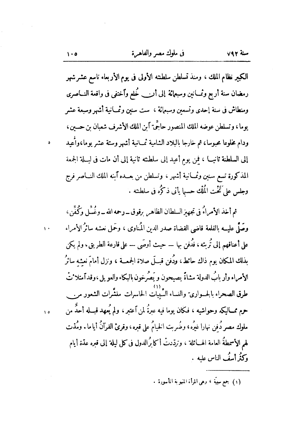 الكبير نظام الملك، ومنذ تسلطن سلطنته الأولى فى يوم الأربعاء تاسع عشر شهر رمضان سنة أربع وثمانين وسبعمائة إلى أن خلع واختفى فى واقعة الناصرى ومنطاش فى سنة إحدى وتسعين وسبعمائة، ست سنين وثمانية أشهر وسبعة عشر يوما، وتسلطن عوضه الملك المنصور حاجّىّ ابن الملك الأشرف شعبان بن حسين، ودام مخلوعا محبوسا، ثم خارجا بالبلاد الشامية ثمانية أشهر وستة عشر يوما، وأعيد إلى السلطنة ثانيا، فمن يوم أعيد إلى سلطنته ثانية إلى أن مات فى ليلة الجمعة المذكورة تسع سنين وثمانية أشهر، وتسلطن من بعده ابنه الملك الناصر فرج وجلس على تخت الملك حسبما يأتى ذكره فى سلطنته.