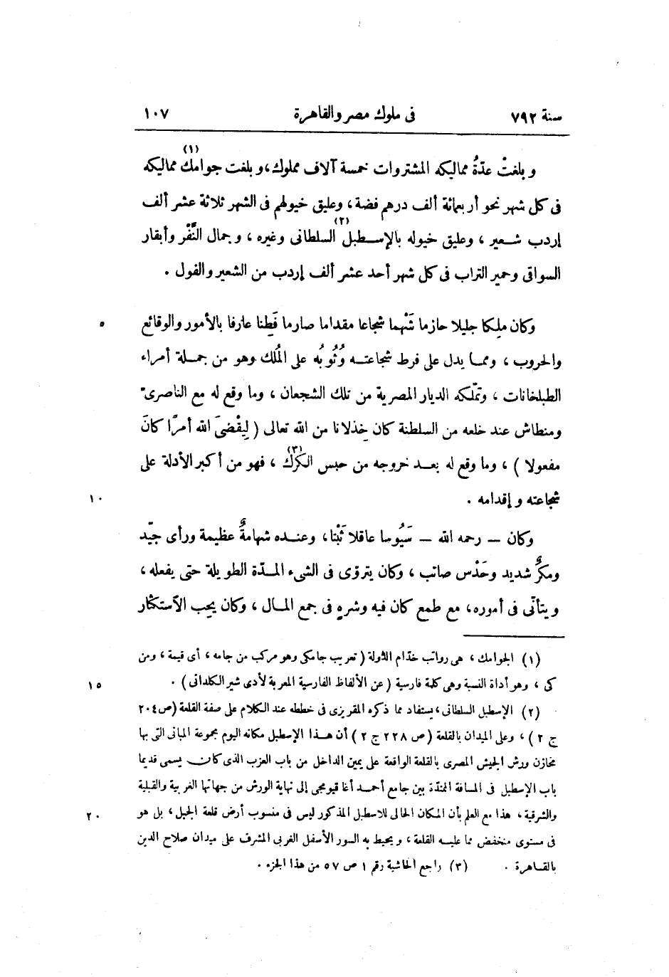 وبلغت عدّة مماليكه المشتروات خمسة آلاف مملوك، وبلغت جوامك «1» مماليكه فى كل شهر نحو أربعمائة ألف درهم فضة، وعليق خيولهم فى الشهر ثلاثة عشر ألف إردب شعير، وعليق خيوله بالإسطبل «2» السلطانى وغيره، وجمال النّفر وأبقار السواقى وحمير التراب فى كل شهر أحد عشر ألف إردب من الشعير والفول.