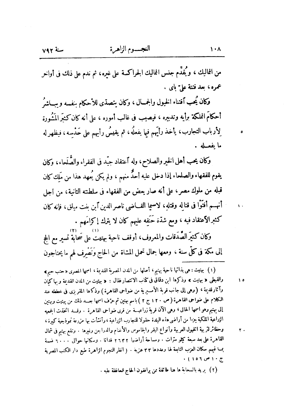 وكان كثير الصّدقات والمعروف، أوقف ناحية بهتيت «1» على سحابة «2» تسير مع الحج إلى مكة فى كلّ سنة، ومعها جمال تحمل المشاة من الحاج وتصرف لهم ما يحتاجون