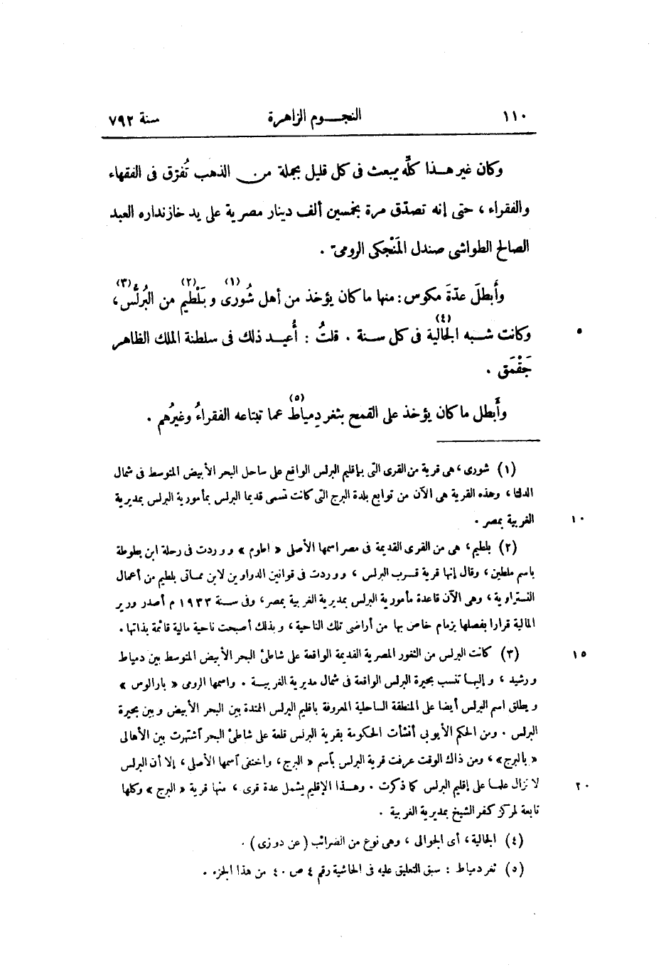 وأبطل عدّة مكوس: منها ما كان يؤخذ من أهل شورى «1» وبلطيم «2» من البرلّس «3» ، وكانت شبه الجالية «4» فى كل سنة. قلت: أعيد ذلك فى سلطنة الملك الظاهر جقمق.