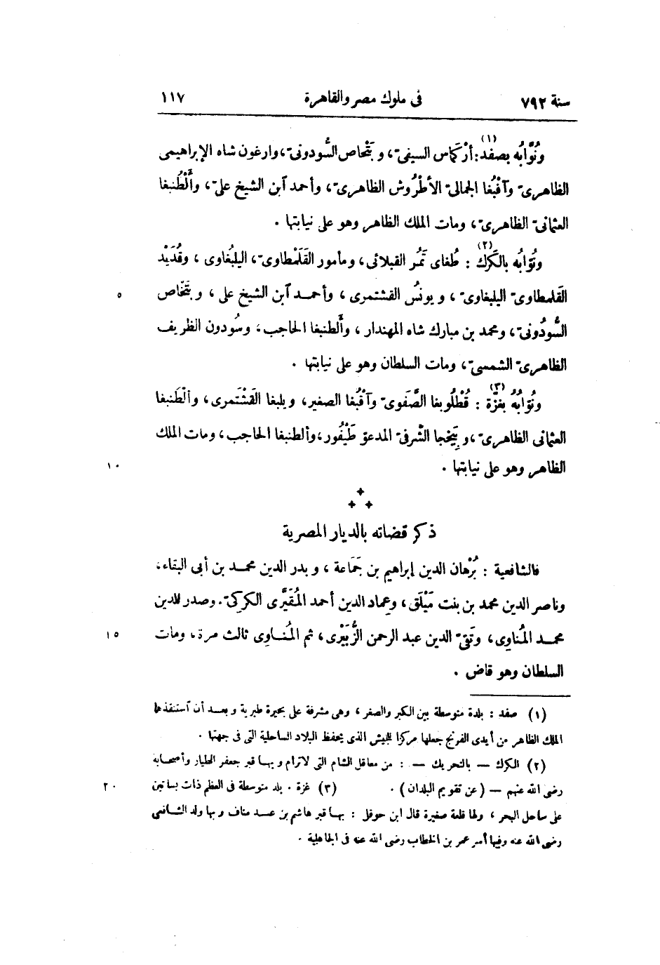 فالشافعية: برهان الدين إبراهيم بن جماعة، وبدر الدين محمد بن أبى البقاء، وناصر الدين محمد بن بنت ميلق، وعماد الدين أحمد المقيّرى الكركىّ. وصدر الدين محمد المناوى، وتقىّ الدين عبد الرحمن الزّبيرى، ثم المناوى ثالث مرة، ومات السلطان وهو قاض.