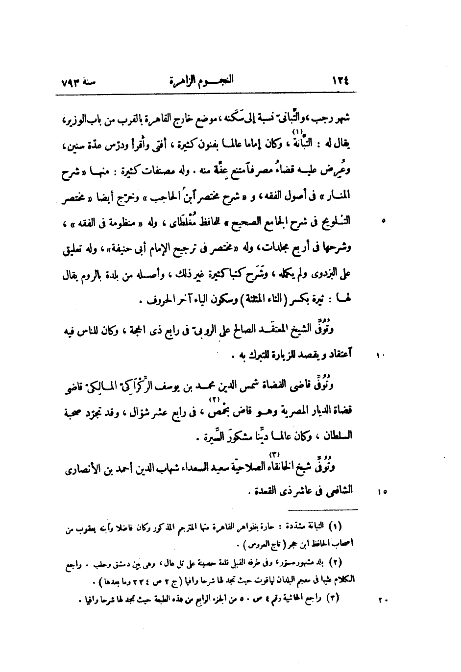 شهر رجب، والتّبانىّ نسبة إلى سكنه، موضع خارج القاهرة بالقرب من باب الوزير، يقال له: التبّانة «1» ، وكان إماما عالما بفنون كثيرة، أفتى وأقرأ ودرّس عدّة سنين، وعرض عليه قضاء مصر فامتنع عفّة منه. وله مصنفات كثيرة: منها «شرح المنار» فى أصول الفقه، و «شرح مختصر ابن الحاجب» وخرّج أيضا «مختصر التلويح فى شرح الجامع الصحيح» للحافظ مغلطاى، وله «منظومة فى الفقه» ، وشرحها فى أربع مجلدات، وله «مختصر فى ترجيح الإمام أبى حنيفة» ، وله تعليق على البزدوى ولم يكمله، وشرح كتبا كثيرة غير ذلك، وأصله من بلدة بالروم يقال لها: ثيرة بكسر (الثاء المثلثة) وسكون الياء آخر الحروف.