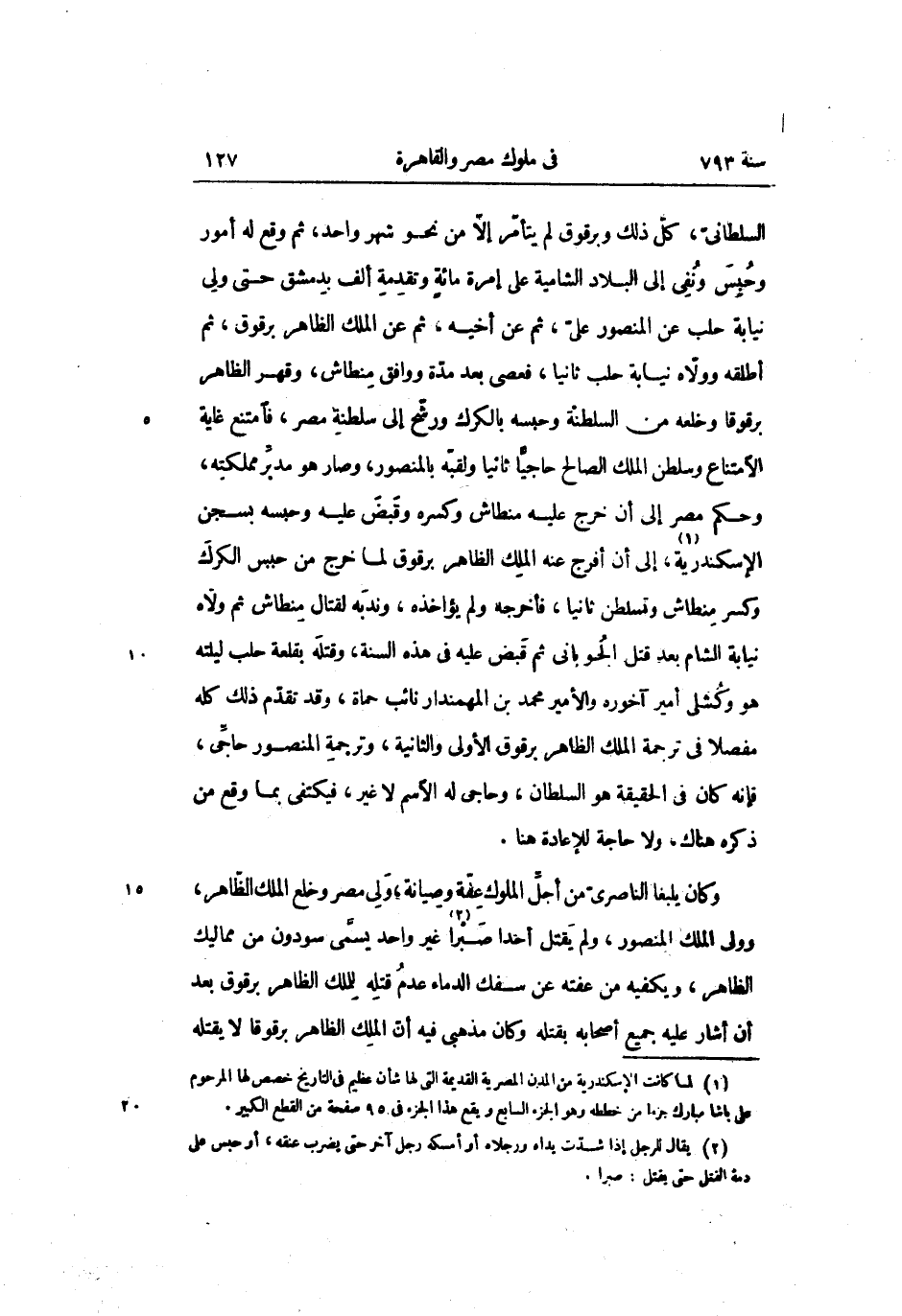 السلطانىّ، كلّ ذلك وبرقوق لم يتأمّر إلّا من نحو شهر واحد، ثم وقع له أمور وحبس ونفى إلى البلاد الشامية على إمرة مائة وتقدمة ألف بدمشق حتى ولى نيابة حلب عن المنصور علىّ، ثم عن أخيه، ثم عن الملك الظاهر برقوق، ثم أطلقه وولّاه نيابة حلب ثانيا، فعصى بعد مدّة ووافق منطاش، وقهر الظاهر برقوقا وخلعه من السلطنة وحبسه بالكرك ورشّح إلى سلطنة مصر، فامتنع غاية الامتناع وسلطن الملك الصالح حاجيّا ثانيا ولقبّه بالمنصور، وصار هو مدبّر مملكته، وحكم مصر إلى أن خرج عليه منطاش وكسره وقبض عليه وحبسه بسجن الإسكندرية «1» ، إلى أن أفرج عنه الملك الظاهر برقوق لما خرج من حببس الكرك وكسر منطاش وتسلطن ثانيا، فأخرجه ولم يؤاخذه، وندبه لقتال منطاش ثم ولّاه نيابة الشام بعد قتل الجوبانى ثم قبض عليه فى هذه السنة، وقتله بقلعة حلب ليلته هو وكشلى أمير آخوره والأمير محمد بن المهمندار نائب حماة، وقد تقدّم ذلك كله مفصلا فى ترجمة الملك الظاهر برقوق الأولى والثانية، وترجمة المنصور حاجّى، فإنه كان فى الحقيقة هو السلطان، وحاجى له الاسم لا غير، فيكتفى بما وقع من ذكره هناك، ولا حاجة للإعادة هنا.