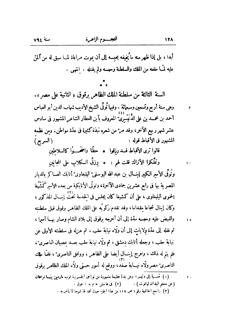 السنة الثالثة من سلطنة الملك الظاهر برقوق «الثانية على مصر» ، وهى سنة أربع وتسعين وسبعمائة. وفيها توفّى الشيخ الأديب شهاب الدين أبو العباس أحمد بن محمد بن على الدّنيسرىّ «1» المعروف بابن العطار الشاعر المشهور فى سادس عشر شهر ربيع الآخر، وقد مرّ من شعره نبذة كثيرة فى عدّة مواطن، ومن نظمه المشهور فى الأقباط قوله: (السريع)