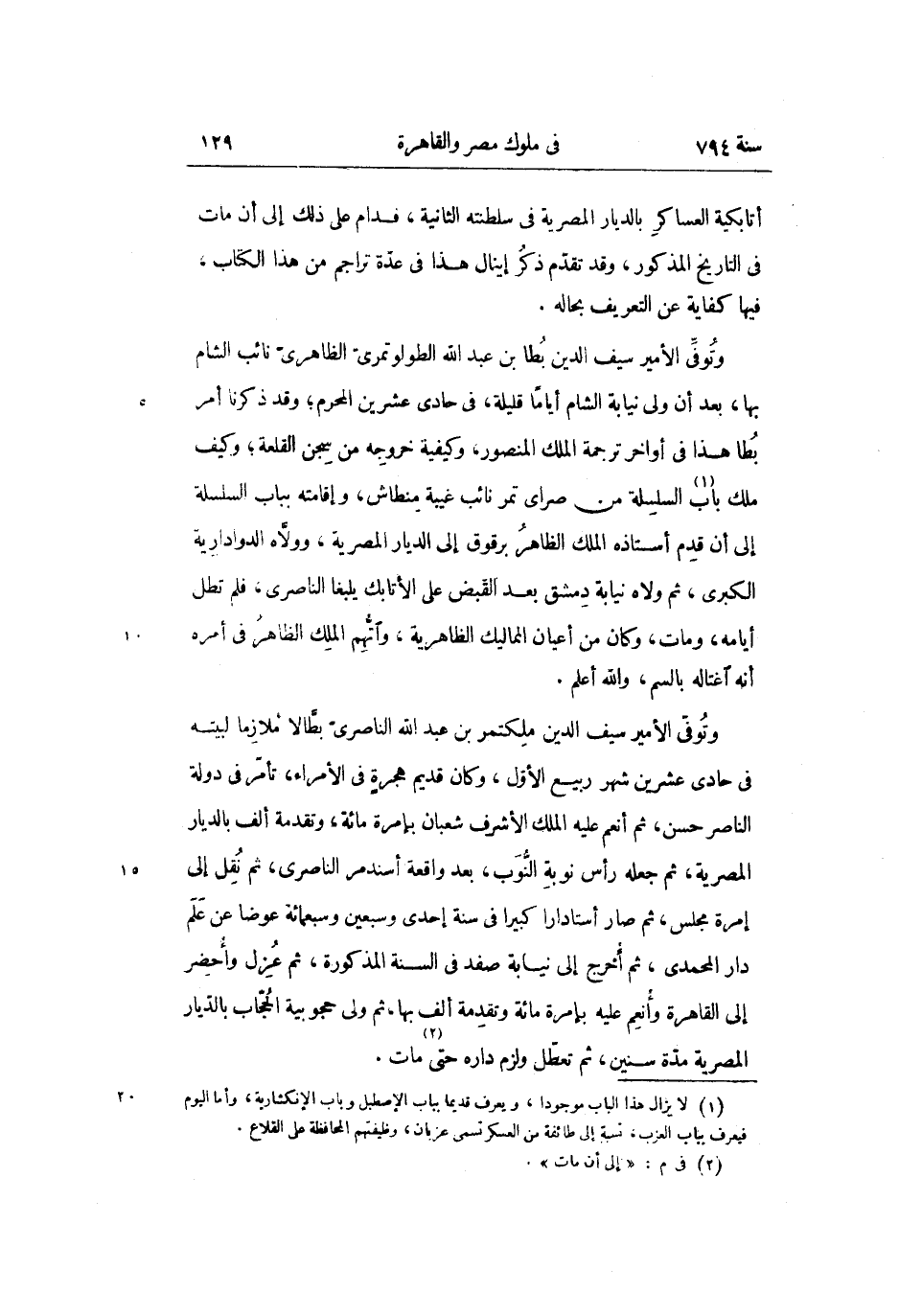 وتوفّى الأمير سيف الدين بطا بن عبد الله الطولوتمرىّ الظاهرىّ نائب الشام بها، بعد أن ولى نيابة الشام أياما قليلة، فى حادى عشرين المحرم؛ وقد ذكرنا أمر بطا هذا فى أواخر ترجمة الملك المنصور، وكيفية خروجه من سجن القلعة؛ وكيف ملك باب «1» السلسلة من صراى تمر نائب غيبة منطاش، وإقامته بباب السلسلة إلى أن قدم أستاذه الملك الظاهر برقوق إلى الديار المصرية، وولّاه الدوادارية الكبرى، ثم ولاه نيابة دمشق بعد القبض على الأتابك يلبغا الناصرى، فلم تطل أيامه، ومات، وكان من أعيان المماليك الظاهرية، واتّهم الملك الظاهر فى أمره أنه اغتاله بالسم، والله أعلم.