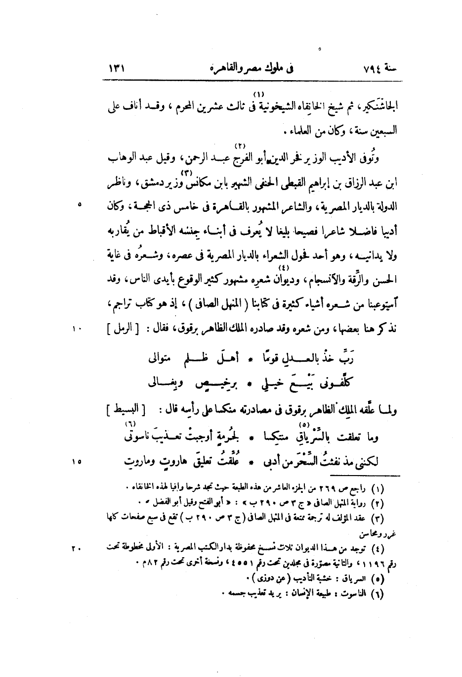 وتوفى الأديب الوزير فخر الدين أبو الفرج «2» عبد الرحمن، وقيل عبد الوهاب ابن عبد الرزاق بن إبراهيم القبطى الحنفى الشهير بابن مكانس «3» وزير دمشق، وناظر الدولة بالديار المصرية، والشاعر المشهور بالقاهرة فى خامس ذى الحجة، وكان أديبا فاضلا شاعرا فصيحا بليغا لا يعرف فى أبناء جنسه الأقباط من يقاربه ولا يدانيه، وهو أحد فحول الشعراء بالديار المصرية فى عصره، وشعره فى غاية الحسن والرّقة والانسجام، وديوان «4» شعره مشهور كثير الوقوع بأيدى الناس، وقد استوعبنا من شعره أشياء كثيرة فى كتابنا (المنهل الصافى) ، إذ هو كتاب تراجم، نذكر هنا بعضها، ومن شعره وقد صادره الملك الظاهر برقوق، فقال: [الرمل]