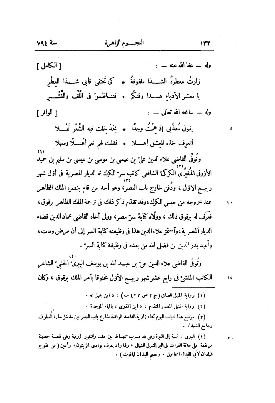 وتوفّى القاضى علاء الدين علىّ بن عبد الله بن يوسف البيرىّ «4» الحلبىّ الشاعر الكاتب المنشئ فى رابع عشر شهر ربيع الأوّل مخنوقا بأمر الملك برقوق، وكان