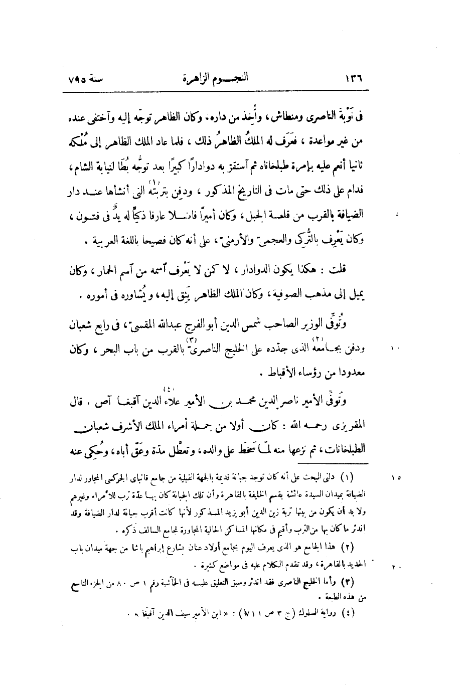 فى نوبة الناصرى ومنطاش، وأخذ من داره، وكان الظاهر توجّه إليه واختفى عنده من غير مواعدة، فعرف له الملك الظاهر ذلك، فلما عاد الملك الظاهر إلى ملكه ثانيا أنعم عليه بإمرة طبلخاناه ثم استقرّ به دوادارا كبيرا بعد توجّه بطا لنيابة الشام، فدام على ذلك حتى مات فى التاريخ المذكور، ودفن بتربته «1» التى أنشأها عند دار الضيافة بالقرب من قلعة الجبل، وكان أميرا فاضلا عارفا ذكيّا له يد فى فتون، وكان يعرف بالتّركى والعجمىّ والأرمنىّ، على أنه كان فصيحا باللغة العربية.