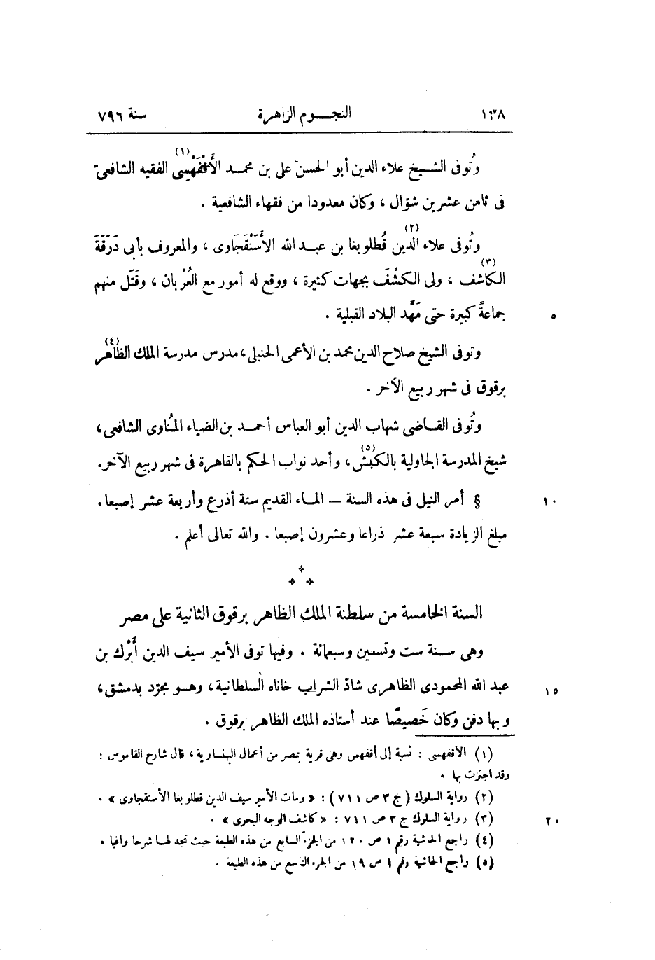 السنة الخامسة من سلطنة الملك الظاهر برقوق الثانية على مصر وهى سنة ست وتسعين وسبعمائة. وفيها توفى الأمير سيف الدين أبرك بن عبد الله المحمودى الظاهرى شادّ الشراب خاناه السلطانية، وهو مجرّد بدمشق، وبها دفن وكان خصيصا عند أستاذه الملك الظاهر برقوق.