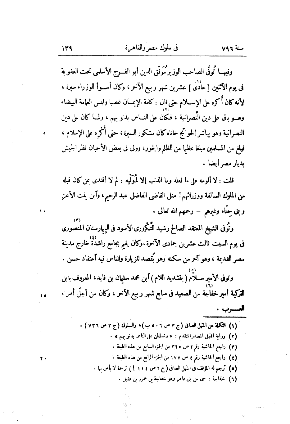 وتوفى الأمير سلّام «5» (بتشديد اللام) ابن محمد سليمان بن فايد، المعروف بابن التركية أمير خفاجة «6» من الصعيد فى سابع شهر ربيع الآخر، وكان من أجلّ أمراء العرب.
