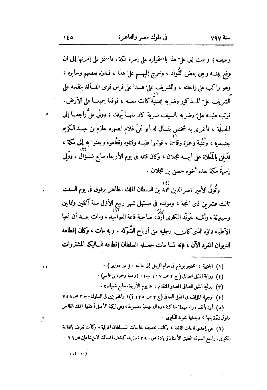وتوفّى الأمير ناصر الدين محمد «4» بن السلطان الملك الظاهر برقوق فى يوم السبت ثالث عشرين ذى الحجة، ومولده فى مستهل شهر ربيع الأوّل سنة اثنتين وثمانين وسبعمائة، وأمّه خوند الكبرى أرد «5» ، صاحبة قاعة العواميد «6» ، ومات بعد أن أعيا الأطباء داؤه الذي كان برجليه من أرياح الشّوكة. وبه مات، وكان إقطاعه الديوان المفرد الآن، فإنه لما مات جعله السلطان إقطاعه لمماليكه المشتروات