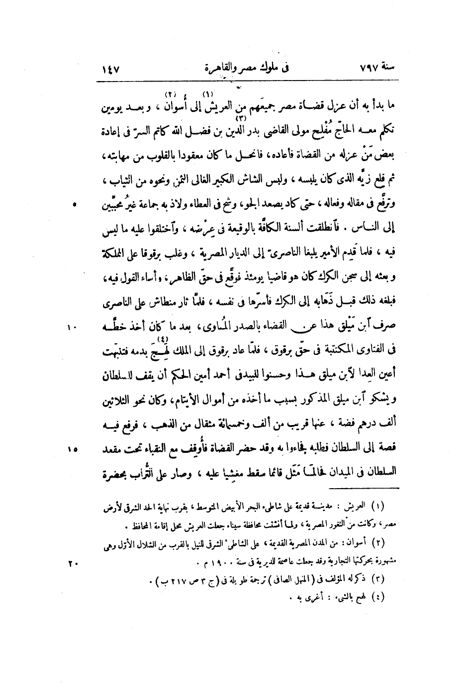 ما بدأ به أن عزل قضاة مصر جميعهم من العريش «1» إلى أسوان «2» ، وبعد يومين تكلم معه الحاجّ مفلح مولى القاضى بدر الدين «3» بن فضل الله كاتم السرّ فى إعادة بعض من عزله من القضاة فأعاده، فانحل ما كان معقودا بالقلوب من مهابته، ثم قلع زيّه الذي كان يلبسه، ولبس الشاش الكبير الغالى الثمن ونحوه من الثياب، وترفّع فى مقاله وفعاله، حتى كاد يصعد الجو، وشح فى العطاء ولاذبه جماعة غير محبّبين إلى الناس. فانطلقت ألسنة الكافّة بالوقيعة فى عرضه، واختلقوا عليه ما ليس فيه، فلما قدم الأمير يلبغا الناصرىّ إلى الديار المصرية، وغلب برقوقا على المملكة وبعثه إلى سجن الكرك كان هو قاضيا يومئذ فوقّع فى حقّ الظاهر، وأساء القول فيه، فبلغه ذلك قبل ذهابه إلى الكرك فأسرّها فى نفسه، فلمّا ثار منطاش على الناصرى صرف ابن ميلق هذا عن القضاء بالصدر المساوى، بعد ما كان أخذ خطّه فى الفتاوى المكتتبة فى حقّ برقوق، فلمّا عاد برقوق إلى الملك لهج «4» بدمه فتنبّهت أعين العدا لابن ميلق هذا وحسنوا للبيد فى أحمد أمين الحكم أن يقف للسلطان ويشكو ابن ميلق المذكور بسبب ما أخذه من أموال الأيتام، وكان نحو الثلاثين ألف درهم فضة، عنها قريب من ألف وخمسمائة مثقال من الذهب، فرفع فيه قصة إلى السلطان فطلبه فجاءوا به وقد حضر القضاة فأوقف مع النقباء تحت مقعد السلطان فى الميدان فحالما مثل قائما سقط مغشيا عليه، وصار على التّراب بحضرة