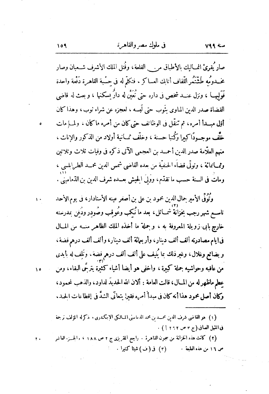 وتوفّى الأمير جمال الدين محمود بن على بن أصفر عينه الأستادار، فى يوم الأحد تاسع شهر رجب بخزانة «2» شمائل، بعد ما نكب وعوقب وصودر ودفن بمدرسته خارج بابى زويلة المعروفة به، وجملة ما أخذه الملك الظاهر منه من المال فى ايام مصادرته ألف ألف دينار، وأربعمائة ألف دينار، وألف ألف درهم فضة، وبضائع وغلال، وغير ذلك بما ينيف على ألف ألف درهم فضة، وتلف له بأيدى من عاقبه وحواشيه جملة كبيرة، واخفى هو أيضا أشياء كثيرة «3» يترجّى البقاء، ومن عطم ما ظهر له من المال، قالت العامة: ألان الله الحديد لداود، والذهب لمحمود، وكان أصل محمود هذا أنه كان فى مبدأ أمره فقيرا يتعانى الشدّ فى إقطاعات الجند،