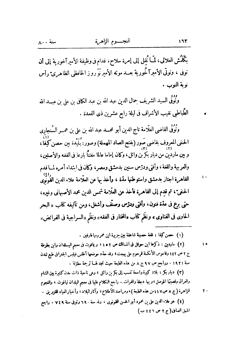 وتوفّى القاضى العلّامة تاج الدين أبو محمد عبد الله بن على بن عمر السّنجارى الحنفى المعروف بقاضى صور (بفتح الصاد المهملة) وصور: بليدة بين حصن كيفا «1» ، وبين ماردين «2» من ديار بكر «3» بن وائل، وكان إماما عالما مفتنّا بارعا فى الفقه والأصلين، والعربية واللغة، وأفتى ودرّس سنين بدمشق ومصر، وكان فى ابتداء أمره لما قدم القاهرة اجتاز بدمشق واستوطنها مدّة، وأخذ بها عن العلّامة علاء الدين القونوى «4» الحنفىّ، ثم قدم إلى القاهرة فأخذ عن العلّامة شمس الدين محمد الأصبهانى وغيره، حتى برع فى عدّة فنون، وأفتى ودرّس وصنّف وأشغل، ومن تآليفه كتاب «البحر الحاوى فى الفتاوى» ونظم كتاب «المختار فى الفقه» ونظم «السراجية فى الفرائض»